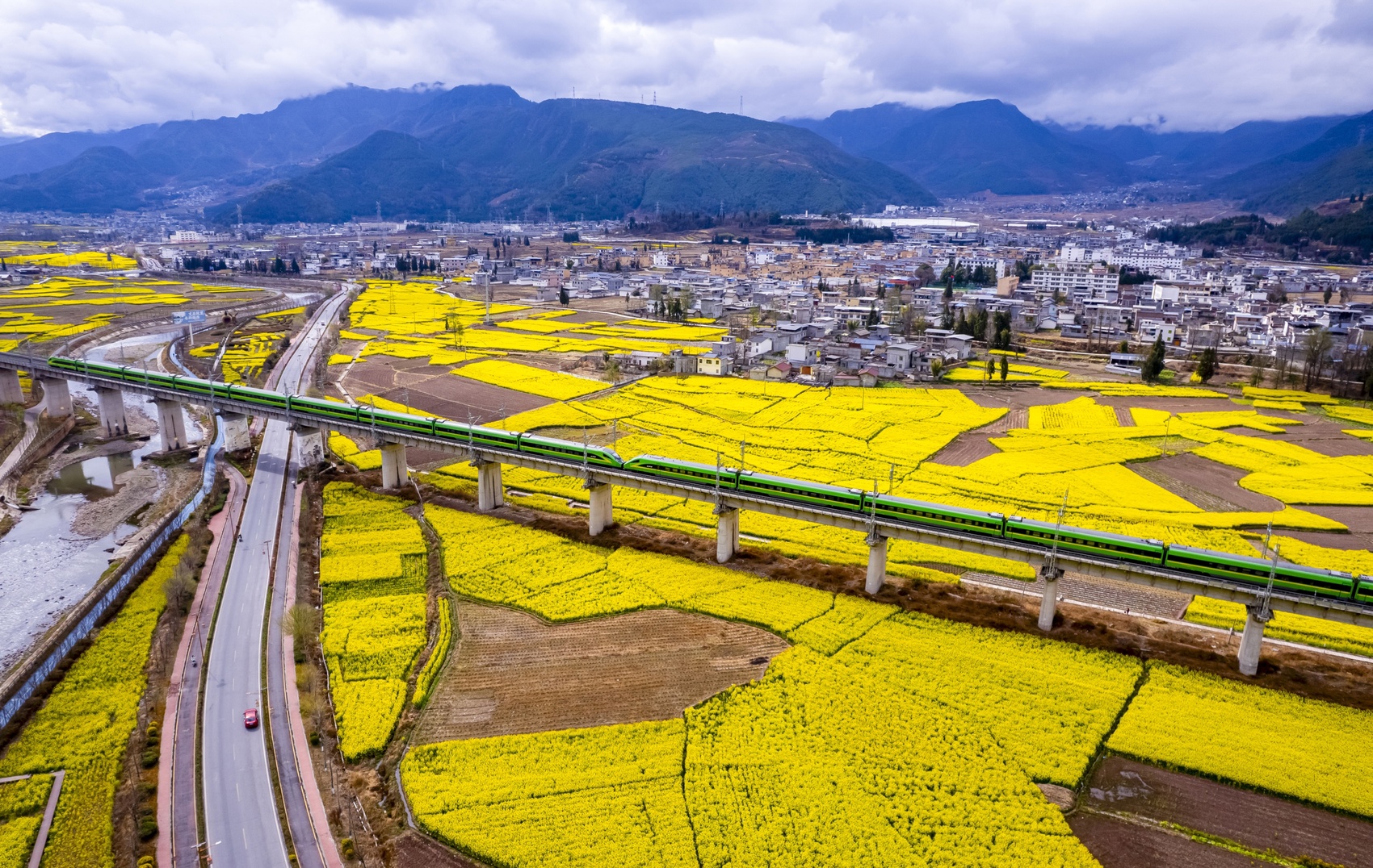 动车穿行在越西油菜花海间。范晓宇 摄