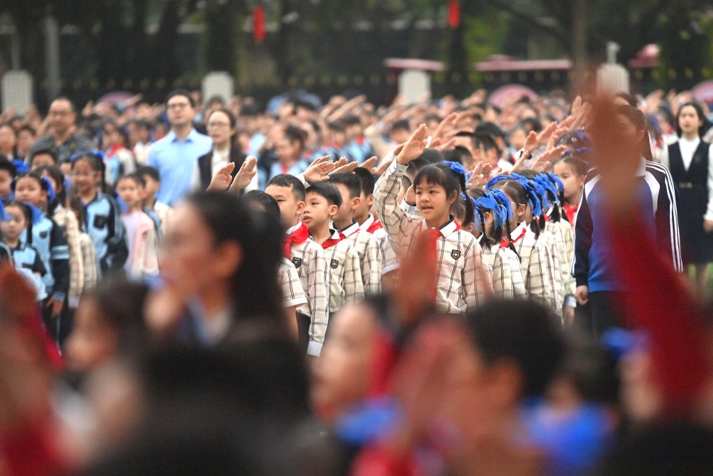 3月2日,在广西南宁市滨湖路小学,孩子们在开学典礼上敬礼。