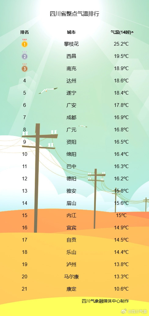 新的一周,四川盆地在春寒料峭中拉开序幕,很多城市都下了雨,其中雅安、乐山、宜宾、泸州的雨下得更有存在感。今天14时,盆地各市气温在13.8~18.9℃之间。