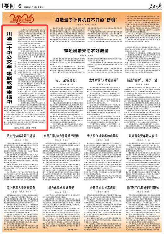 随着川渝毗邻地区陆续开通26条跨省城际公交线路,探亲的路逐渐畅行。就拿川渝20路来说:车站设在村口、场镇,坐车方便、车次频繁;公交线路与重庆轨道交通莲花站、双凤桥站相接,能快速到达重庆主城多数地区。“女儿回来也方便,从月月见到周周见。”晃晃手中公交一卡通,邱大爷笑得开心,“老年卡川渝通用,坐车还不花钱。”
