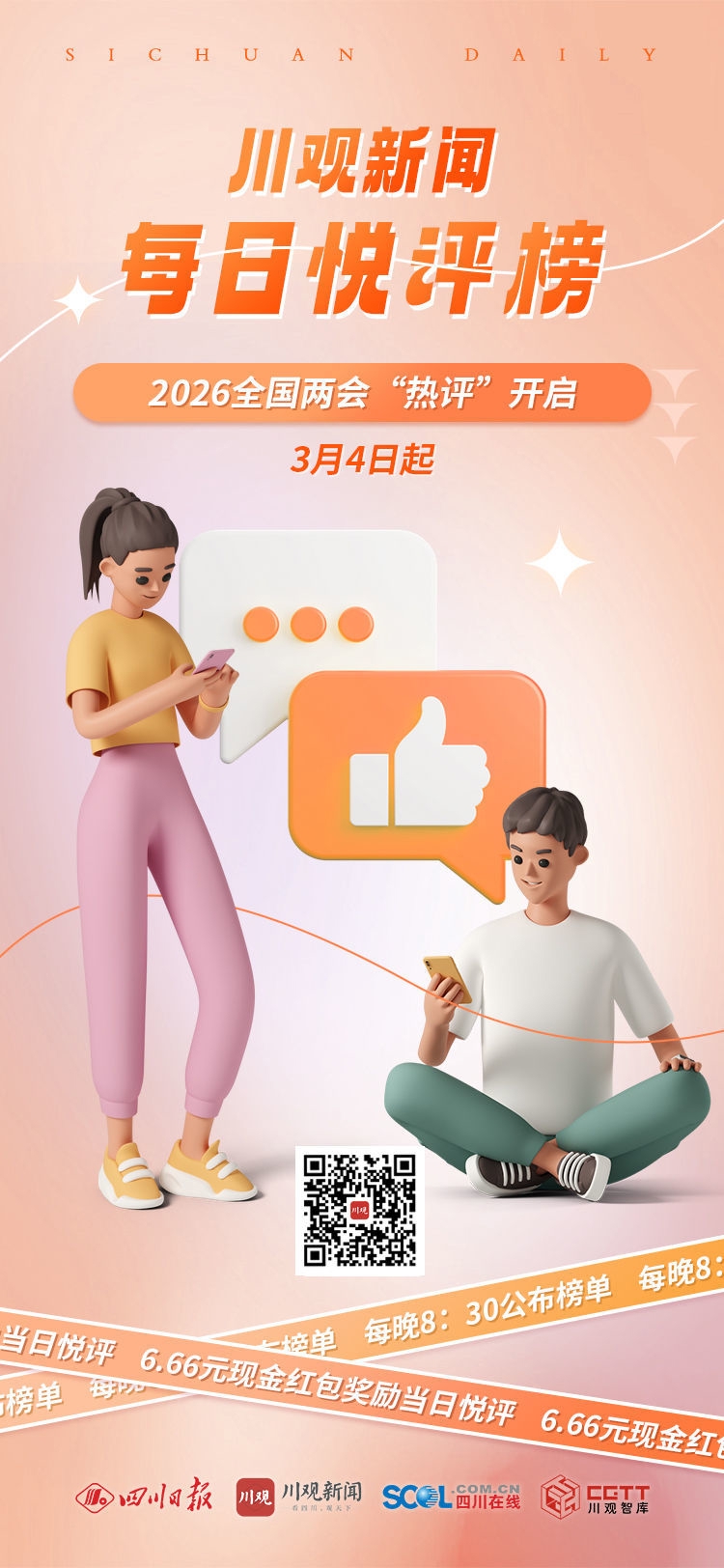 两会期间,除了从全国两会稿件中选取10条“两会热评”外,我们还会从其他新闻稿件中精选10条优质评论,登上“每日悦评榜”,同样可以领取6.66元现金红包。