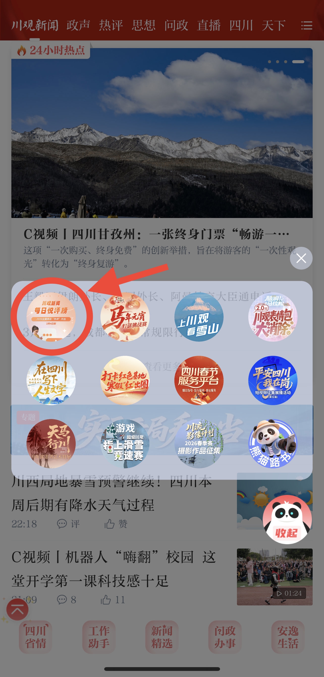 在川观新闻首页,点击右下方悬浮球,找到“每日悦评榜”图片点击即可查看。