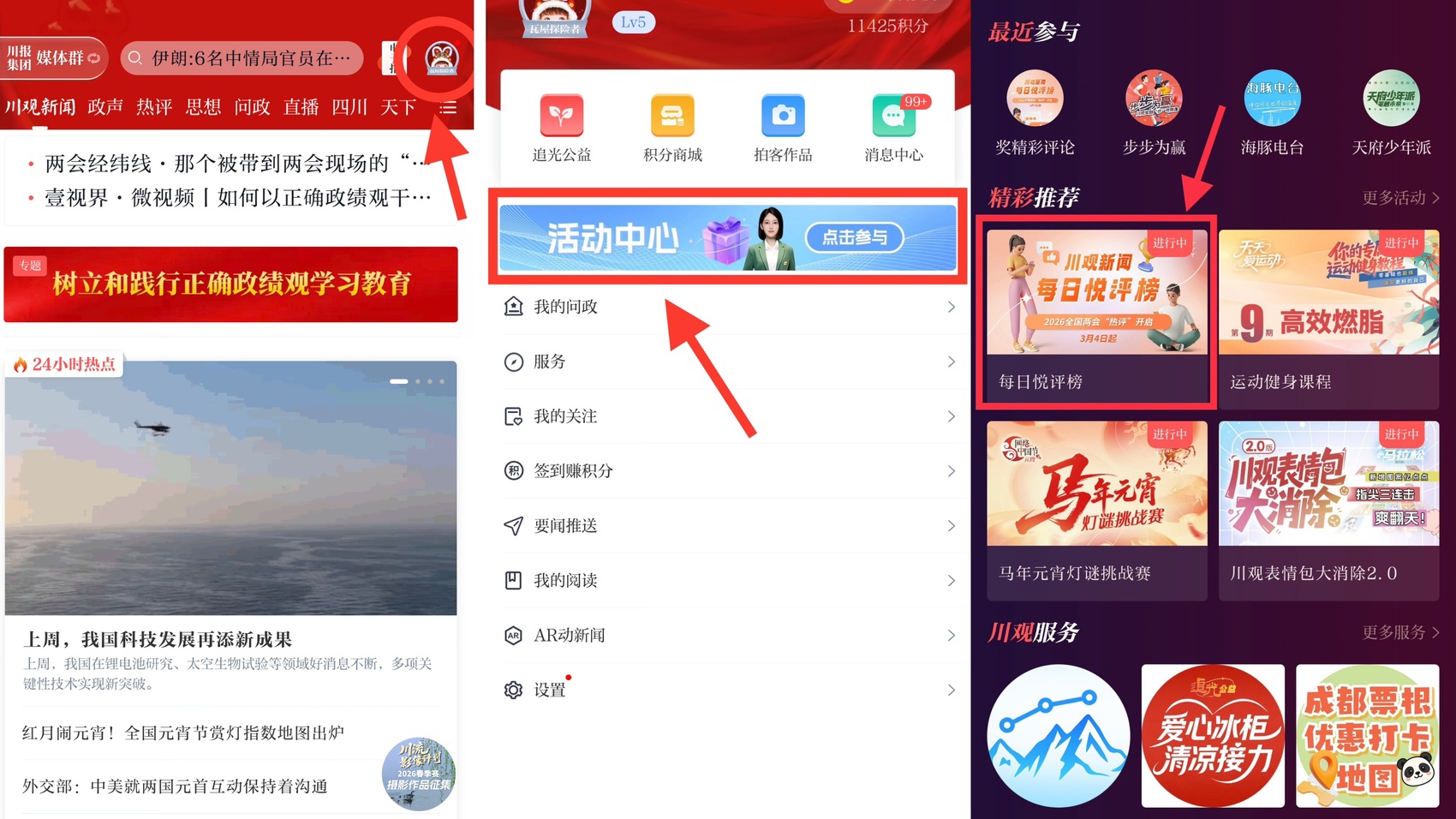 在川观新闻首页,点击右上方头像—活动中心,找到“每日悦评榜”图片点击即可查看。