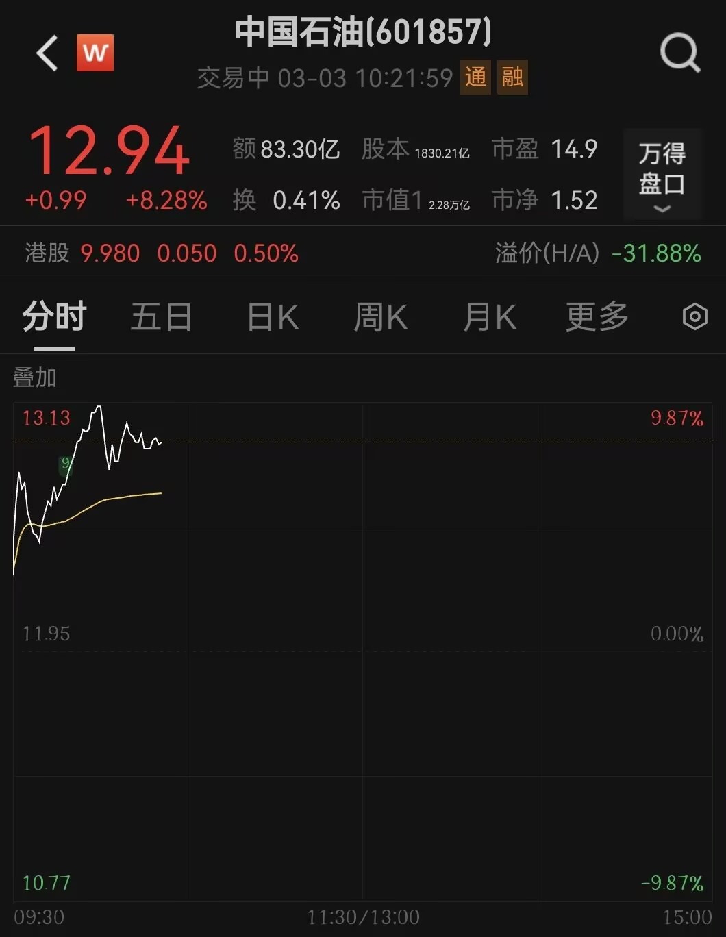 3月3日早盘,国内资本市场快速反应。截至发稿,上海原油期货主力合约涨停,涨幅达12%;液化石油气LPG主连涨超8%,甲醇、低硫燃料油涨超7%,能源化工板块集体走强。