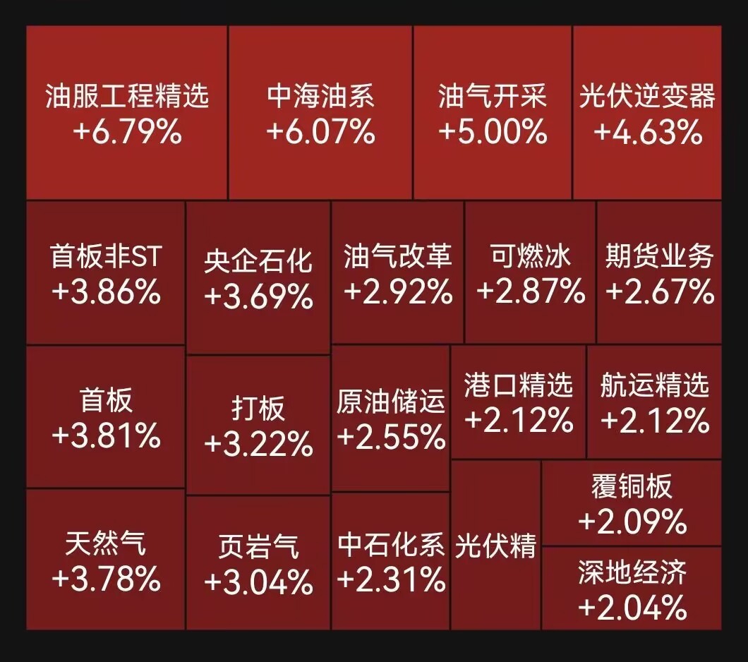 此外,油气开采、油服设备等板块领涨全市场;光伏设备、航运板块同步走强,军工、有色板块承压走弱。