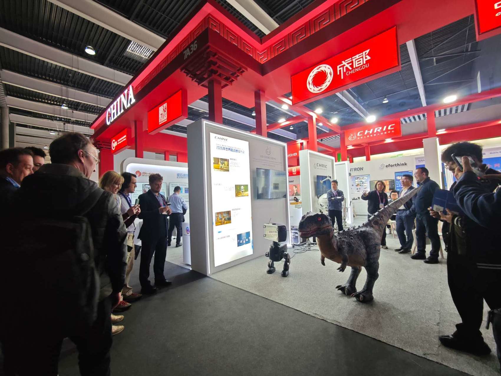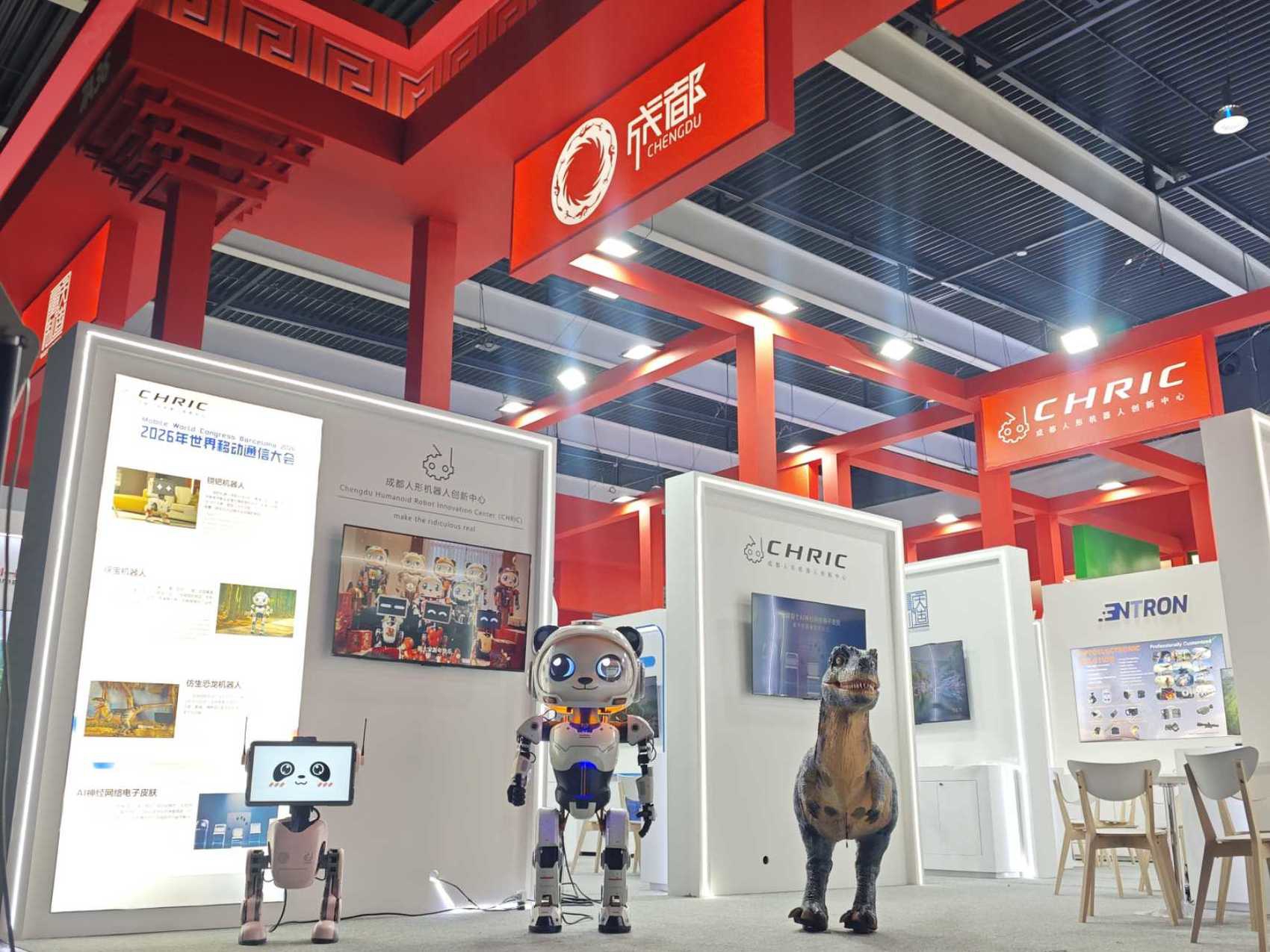 展会现场,位于中国馆核心区的创新中心展位人气满满,4款代表性“成都造”产品尤为亮眼: 已广泛应用于文商旅体场景、搭载全栈自研“最强大脑”的镋钯机器人;将国宝大熊猫萌趣形态与人形机器人技术深度融合的“锦宝”;可实现双足自由行走、活灵活现的仿生恐龙机器人;以及拥有全球领先感知性能的AI神经网络电子皮肤。