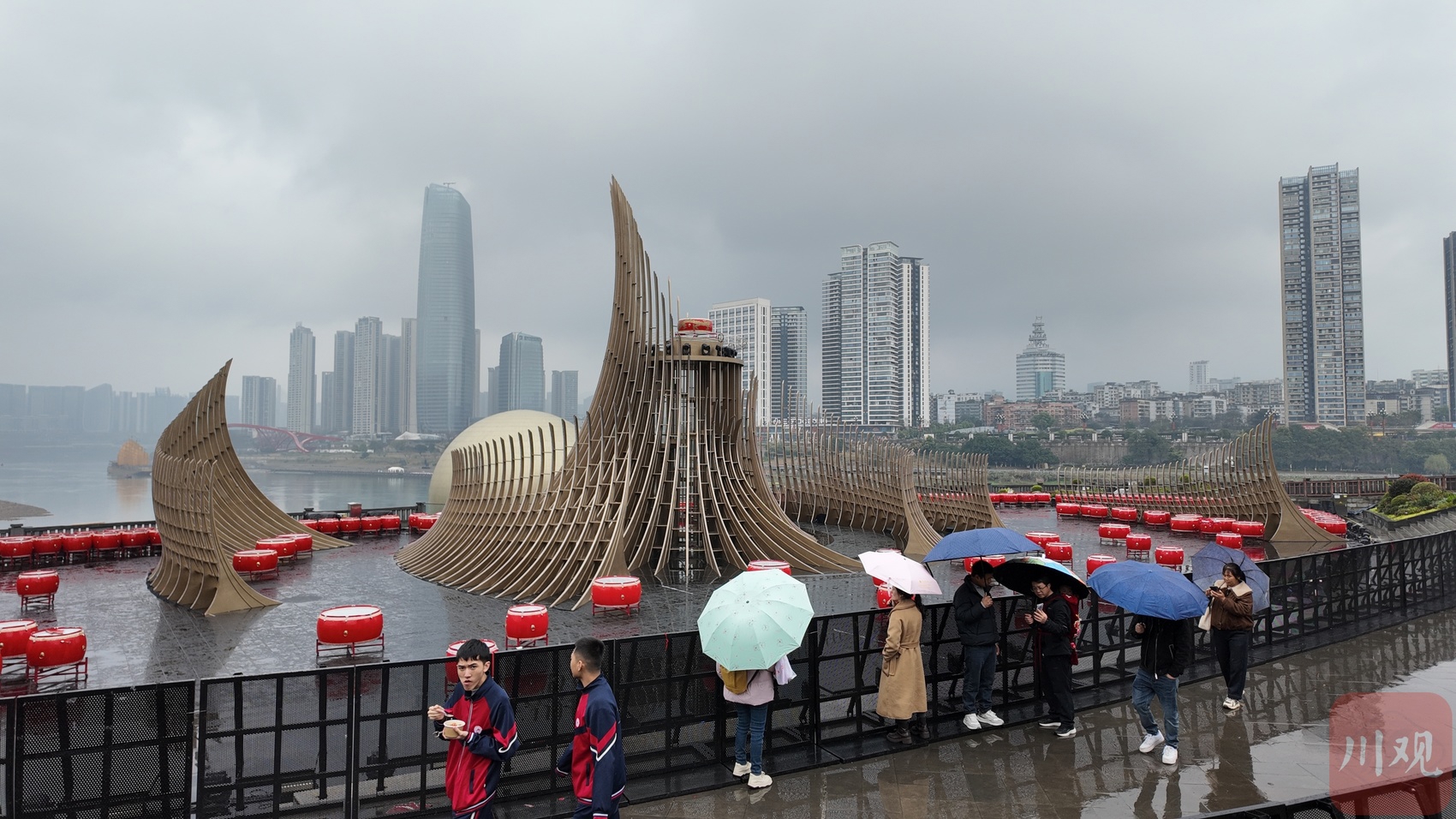 “这就是春晚那个‘竹笋’舞台!”一位游客指着装置向同伴介绍。走进主舞台,层叠式立体设计扑面而来。 层层弧线向上延展,既像江水蜿蜒流淌,又像春笋破土而出,更像一艘巨船扬帆启航。舞台周围,除夕夜使用的锣鼓依然保留着,红色的装置在雨中格外醒目。站在这里,“山水皆舞台”,此刻虽无演出,但除夕之夜《立上游》的震撼画面仿佛再次浮现眼前。