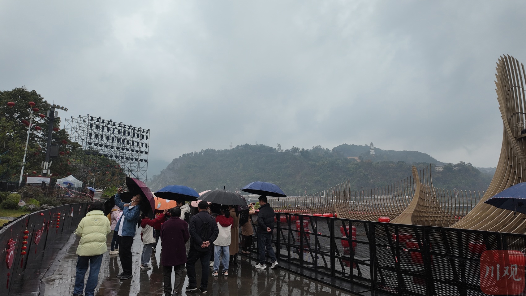 “宜宾分会场 我与总台春晚同频宜宾”“我在总台春晚和你连线”——两处打卡装置前,撑伞的游客排起小队,有人收伞快速按下快门,有人干脆让同伴撑着伞,自己站进镜头里比个手势。