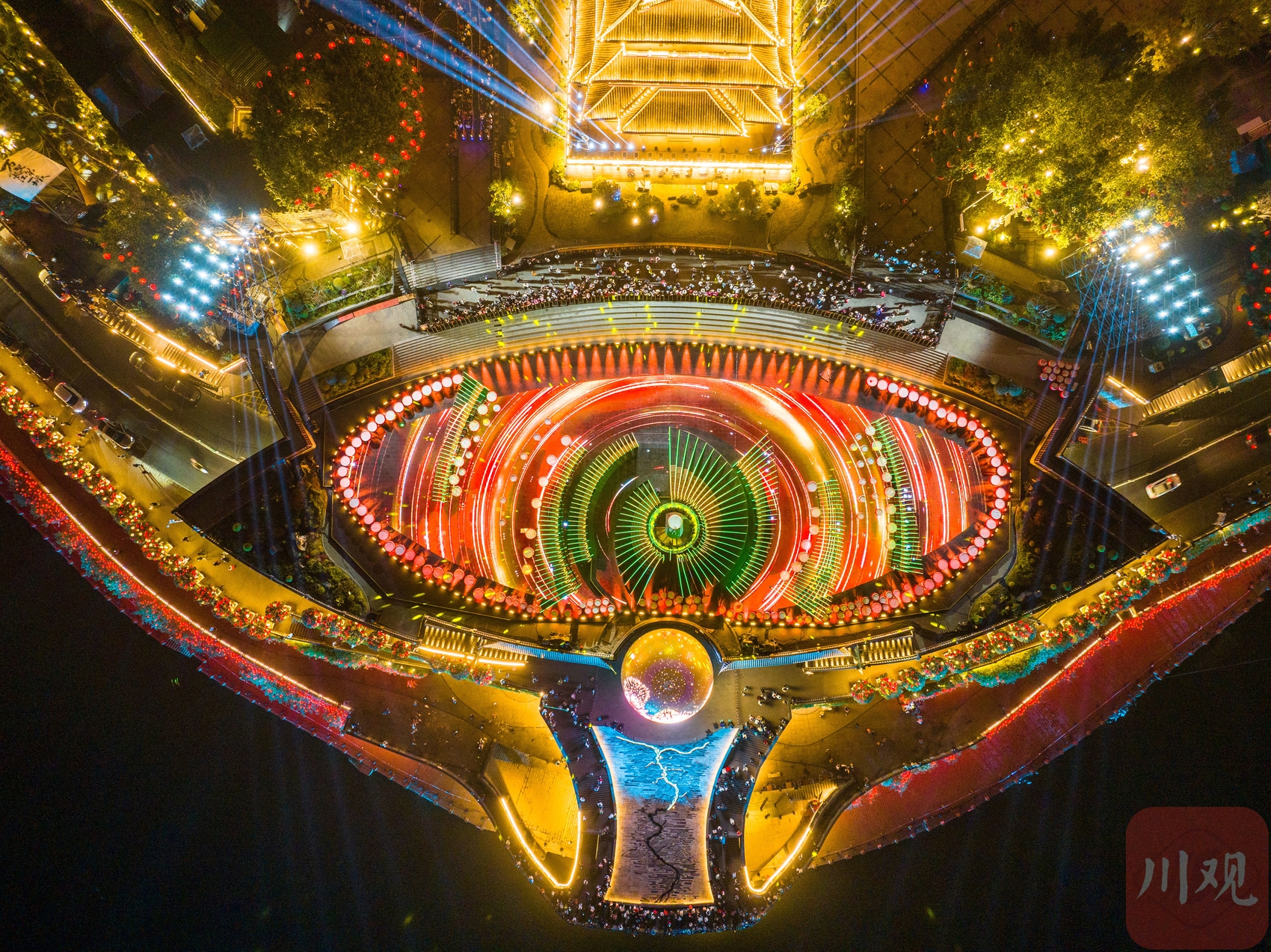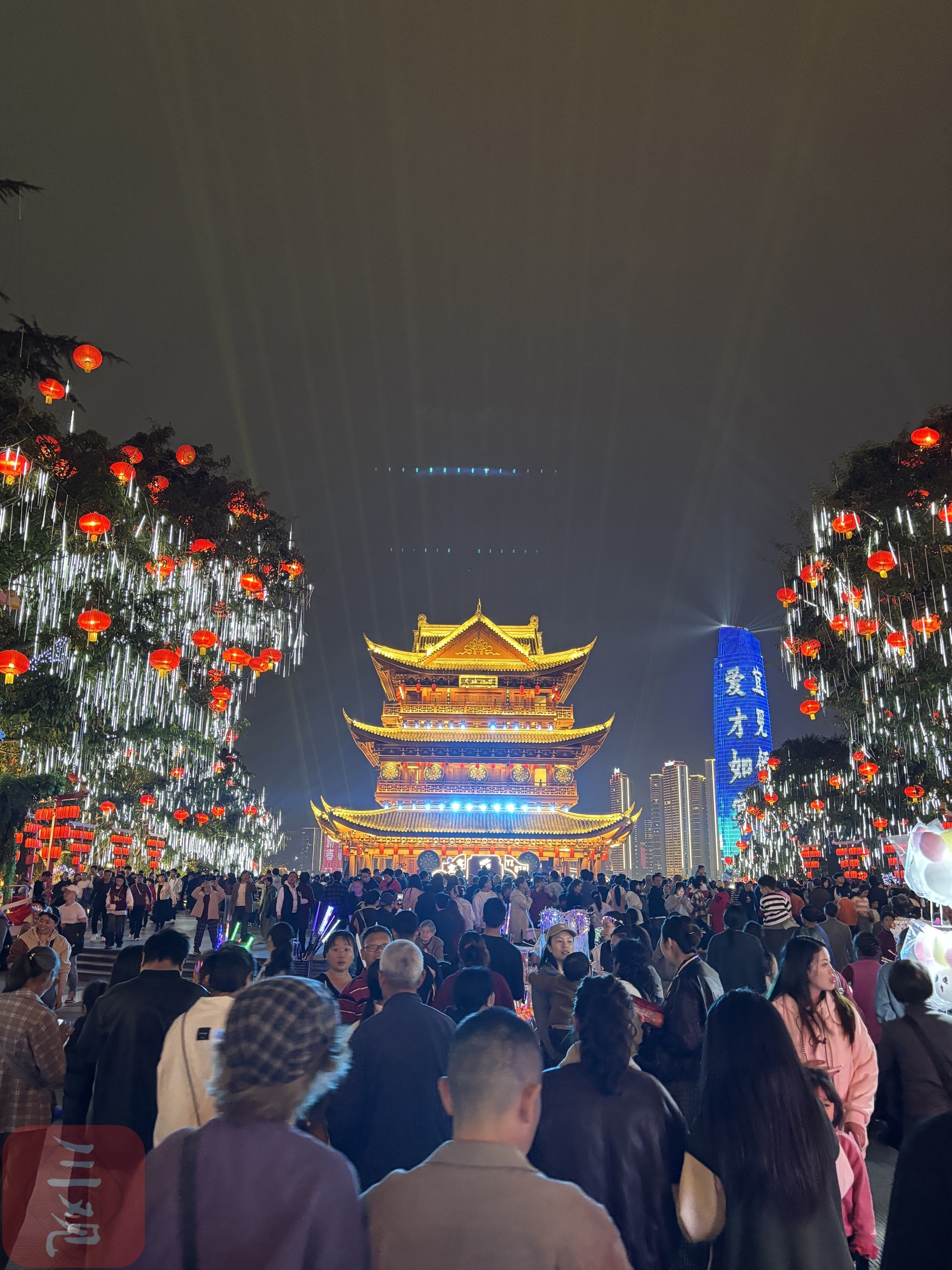 “每天都是人潮涌动。”现场执勤人员介绍,从正月初二起,主舞台便限时向公众免费开放,每日10时至22时,实行排队流动打卡。春节假期结束后人流稍有回落,元宵节前这两天虽然下雨,依然挡不住大家的热情。“晚上比白天人更多,很多人是冲着灯光亮起后的景色来的。”他指了指远处的排队通道,“最多的时候,队伍能排到几百米外的合江街,至少有上万人,我们现场有100多人维护秩序,引导大家有序进场。”