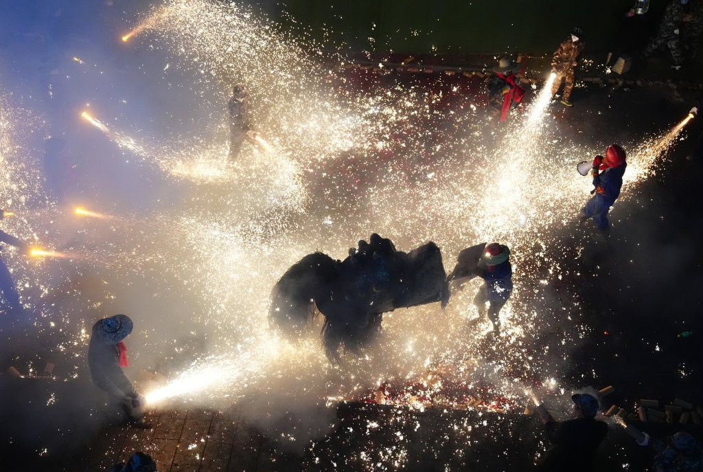 3月2日,在陕西旬阳市蜀河镇蜀河社区,表演人员在用烟花“烧狮子”。