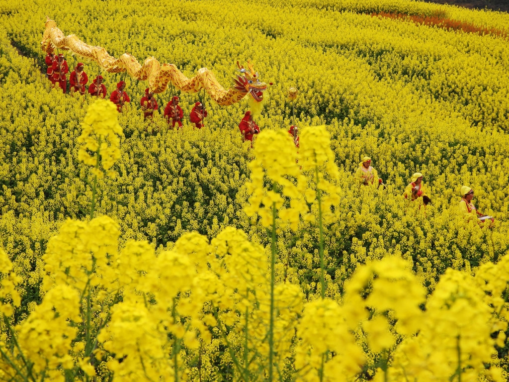 3月2日,人们在四川省达州市达川区龙会乡的油菜花田间表演舞龙。