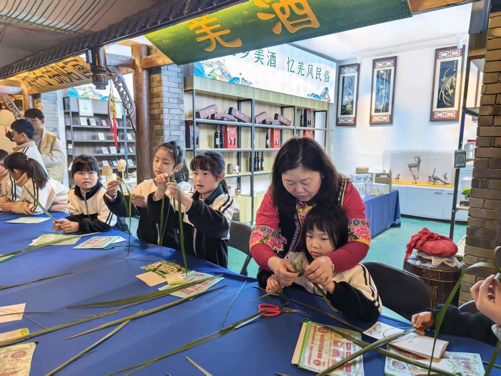 在羌绣工坊,几名身穿民族服饰的羌族妇女,手把手教孩子们用棕榈叶编织出各种小动物。看着柔韧的棕榈叶在手中逐渐变成“蚂蚱”“羊”等作品,孩子们脸上笑开了花,家长也不停地拍照留影发抖音。