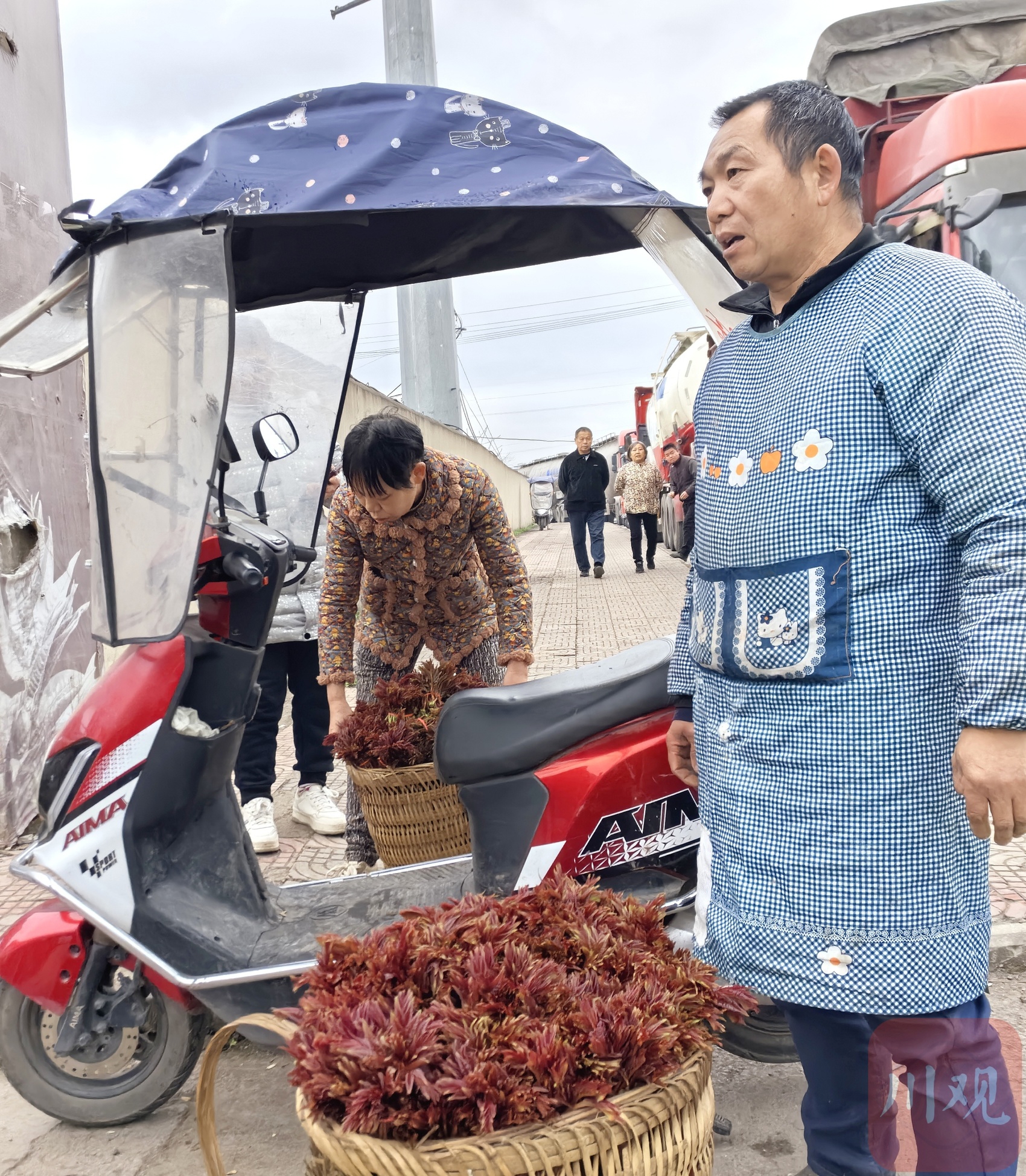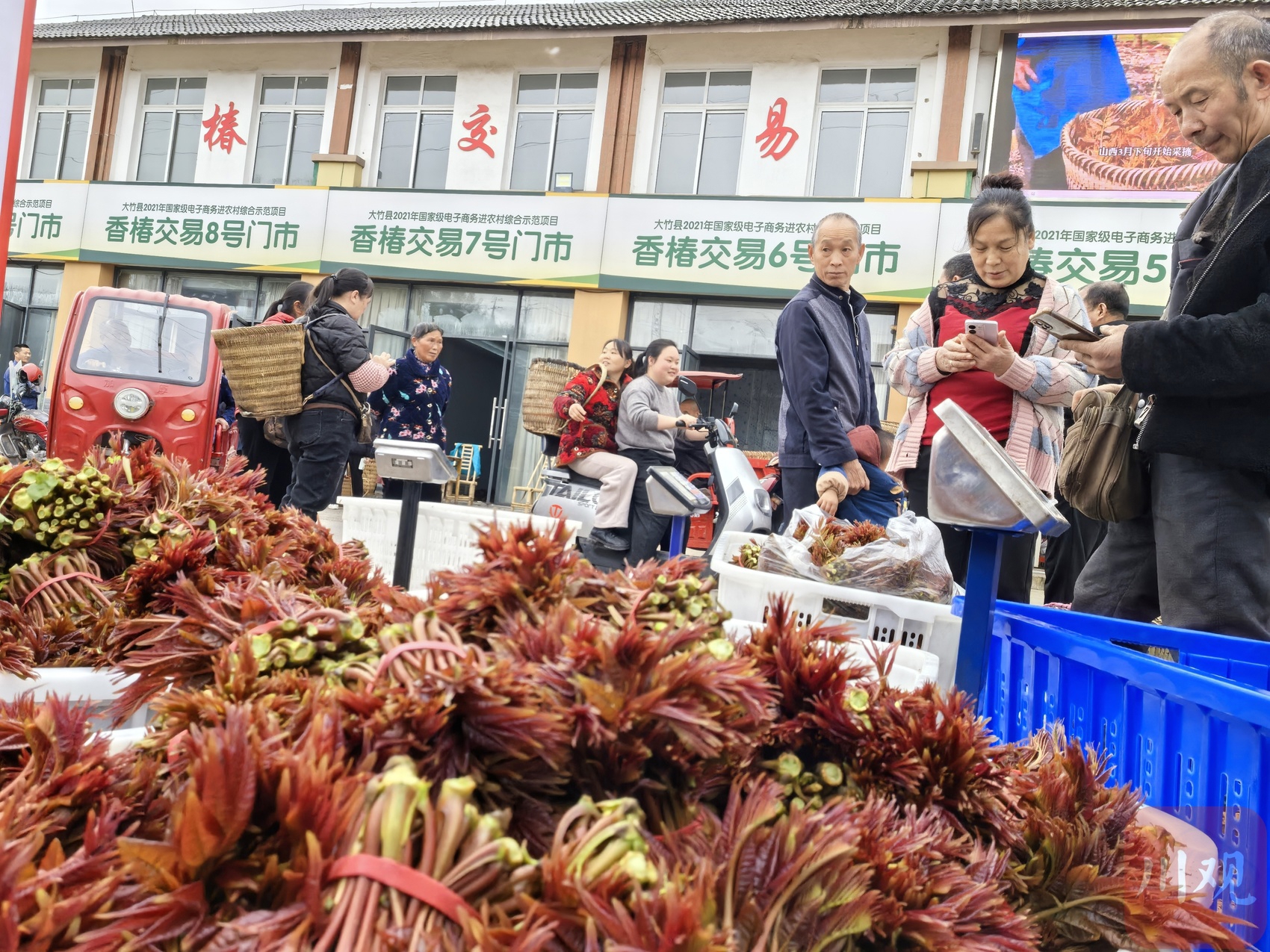 大竹县香椿种植规模约15万亩,有“中国香椿第一县”的美誉。大竹香椿交易中心是该县最大的香椿交易市场。8点,交易中心有4家收购商开门。到了9点半,这里收购商达到10多家。骑三轮车、摩托车或者背背篼前来卖香椿的椿农络绎不绝,市场上人声鼎沸、交易繁忙。