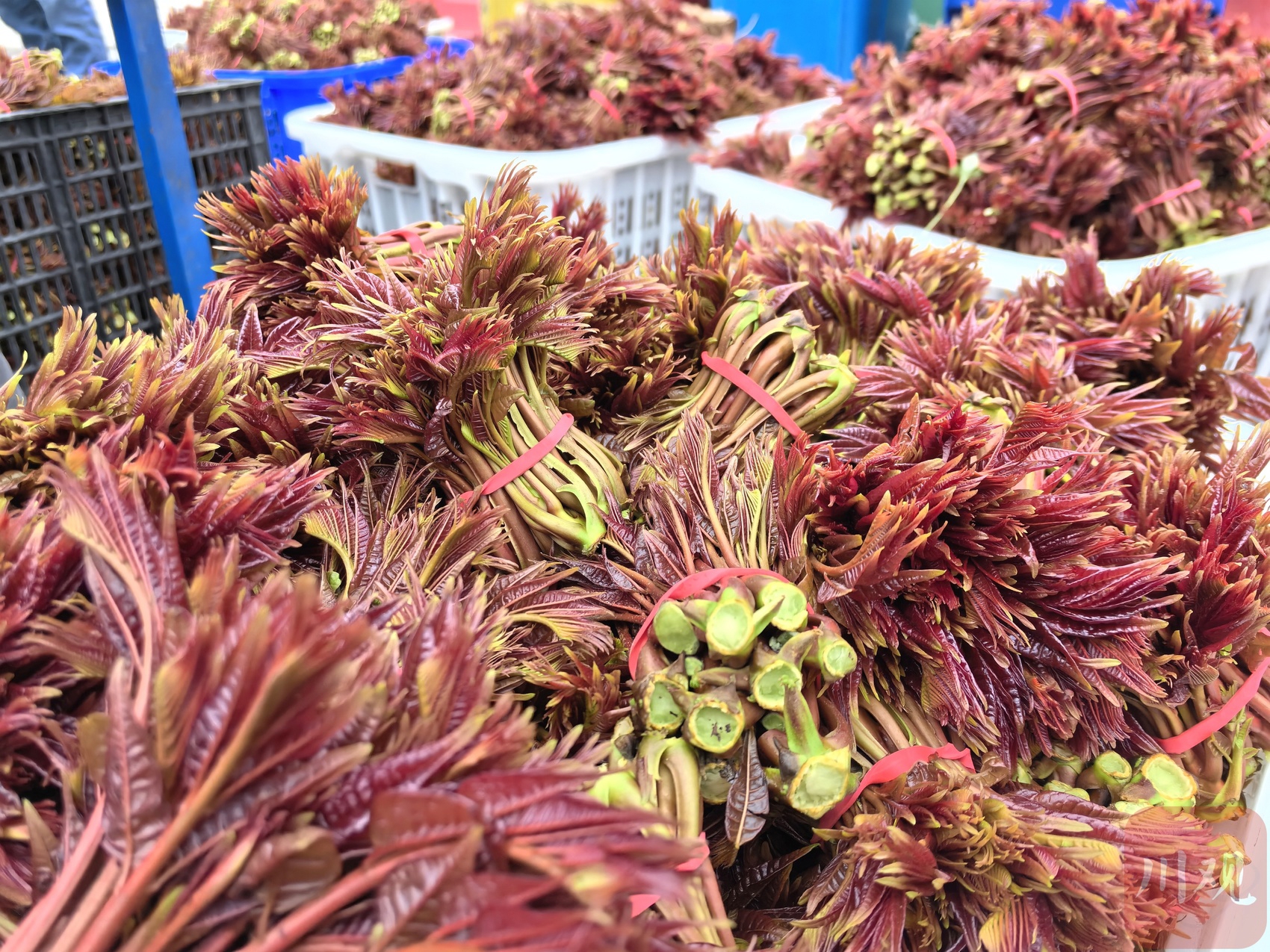 椿农背篼里的香椿,尽是几厘米长的鲜红椿芽,用橡皮筋捆成拳头大小一把,散发着一股浓郁的酯香味。