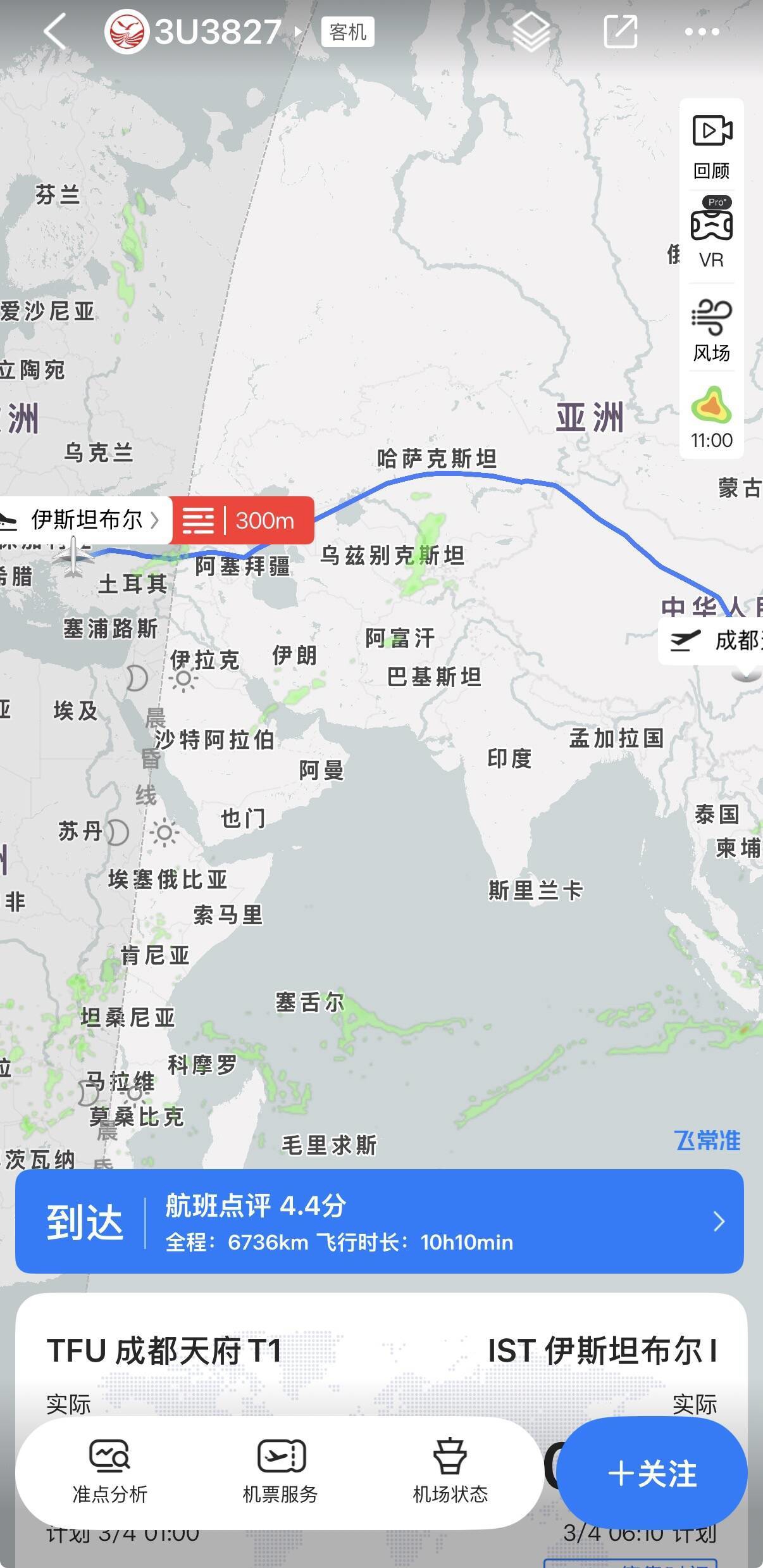 3月4日上午11时,川航官网航班显示,由成都直飞伊斯坦布尔的四川航空3U3827航班按计划抵达伊斯坦布尔。该航班于北京时间01:17从成都天府国际机场起飞,在当地时间06:26抵达伊斯坦布尔,全程飞行时长约10小时11分钟。抵达后,该航班还将继续飞至希腊雅典,计划于当地时间08:10到达。