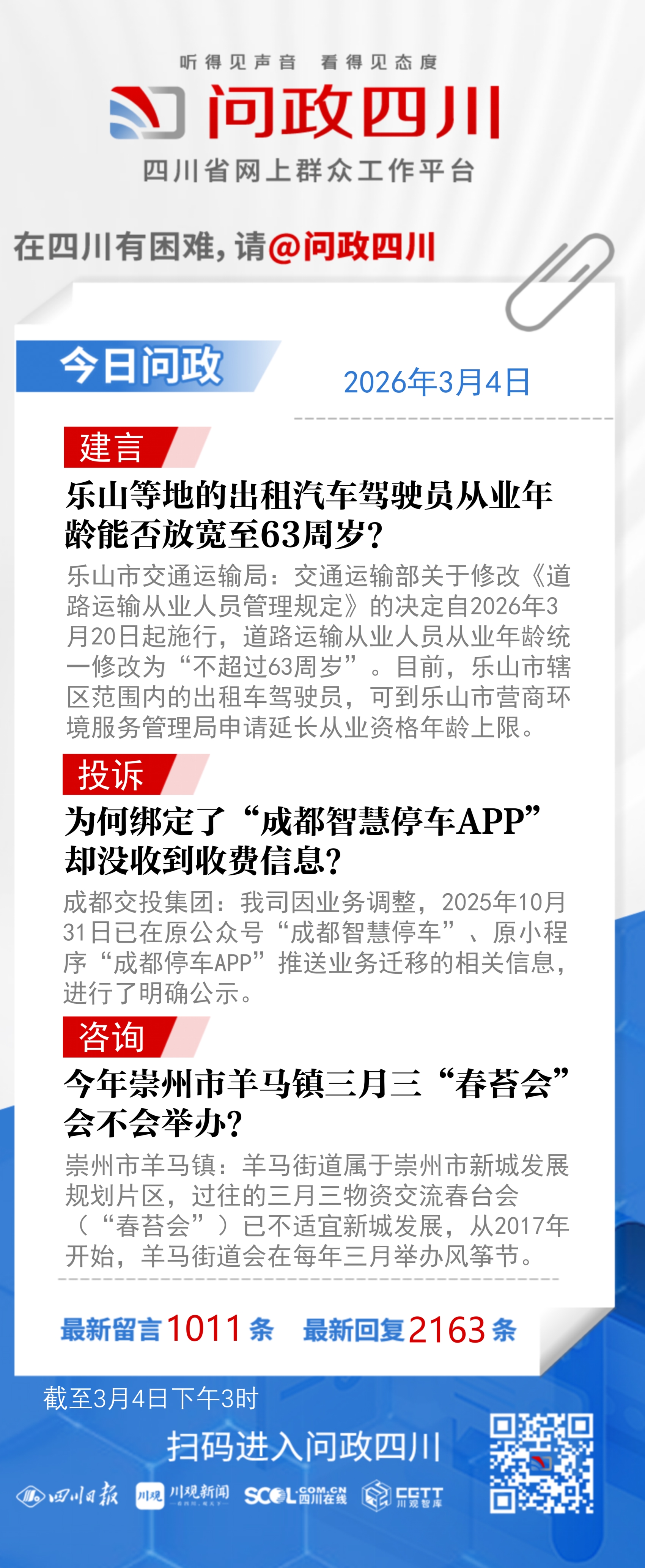 问政四川网友提问:根据交通运输部2026年第4号令,新修订的《道路运输从业人员管理规定》,经营性道路旅客运输驾驶员年龄上限由60周岁放宽至63周岁。请问乐山等地的出租汽车驾驶员从业年龄上限能否同步放宽至63周岁?