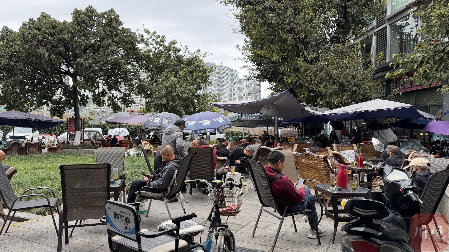 滨河中路一带,遍布社区茶馆,大家共用公共院坝,摆布茶桌椅子。