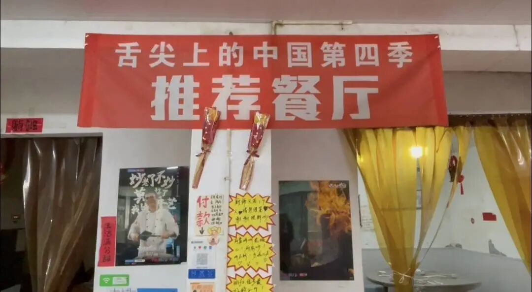 “石沟大饭店”店内悬挂的“舌尖上的中国第四季推荐餐厅”横幅