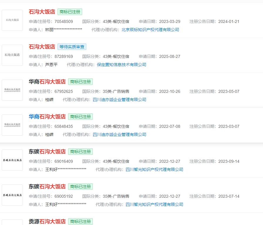 在随后的查询中,王俊还发现了更多的抢注信息。“注册时间从2023年开始到2025年,啥子(编者注:这些商标名称包括)‘华商石沟大饭店’‘光大街石沟大饭店’‘贡源石沟大饭店’‘源贡石沟大饭店’等。”王俊说。