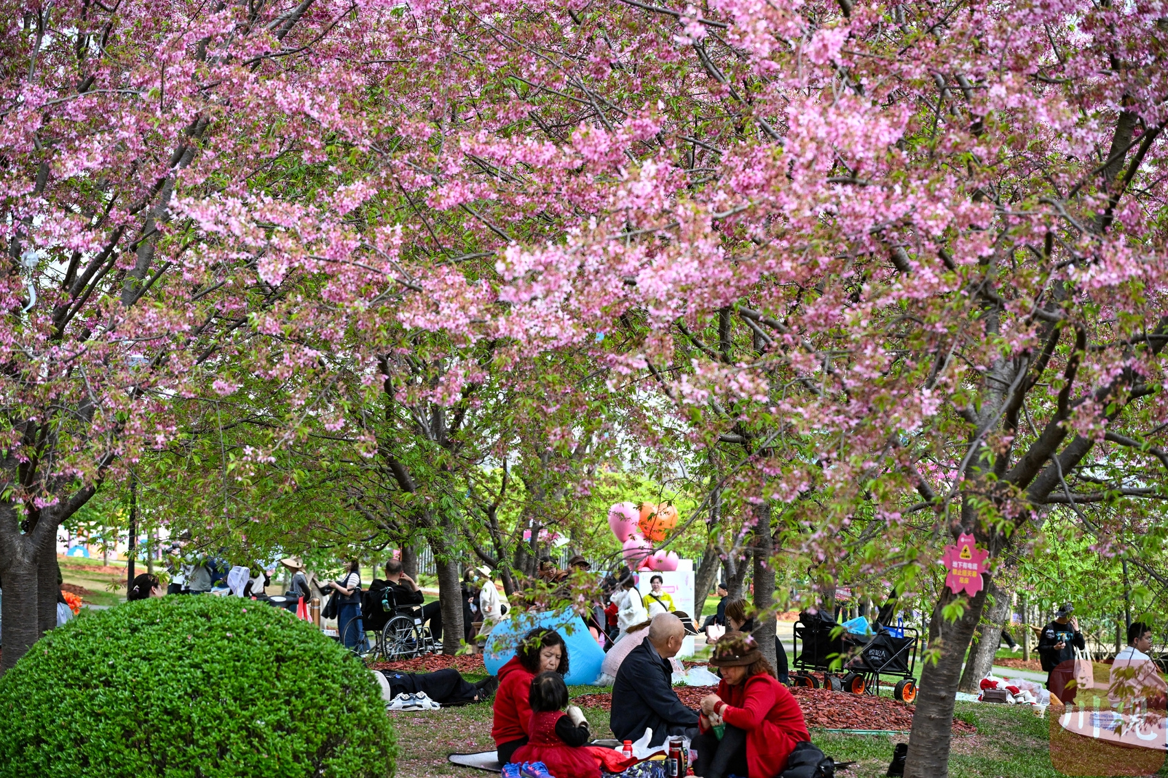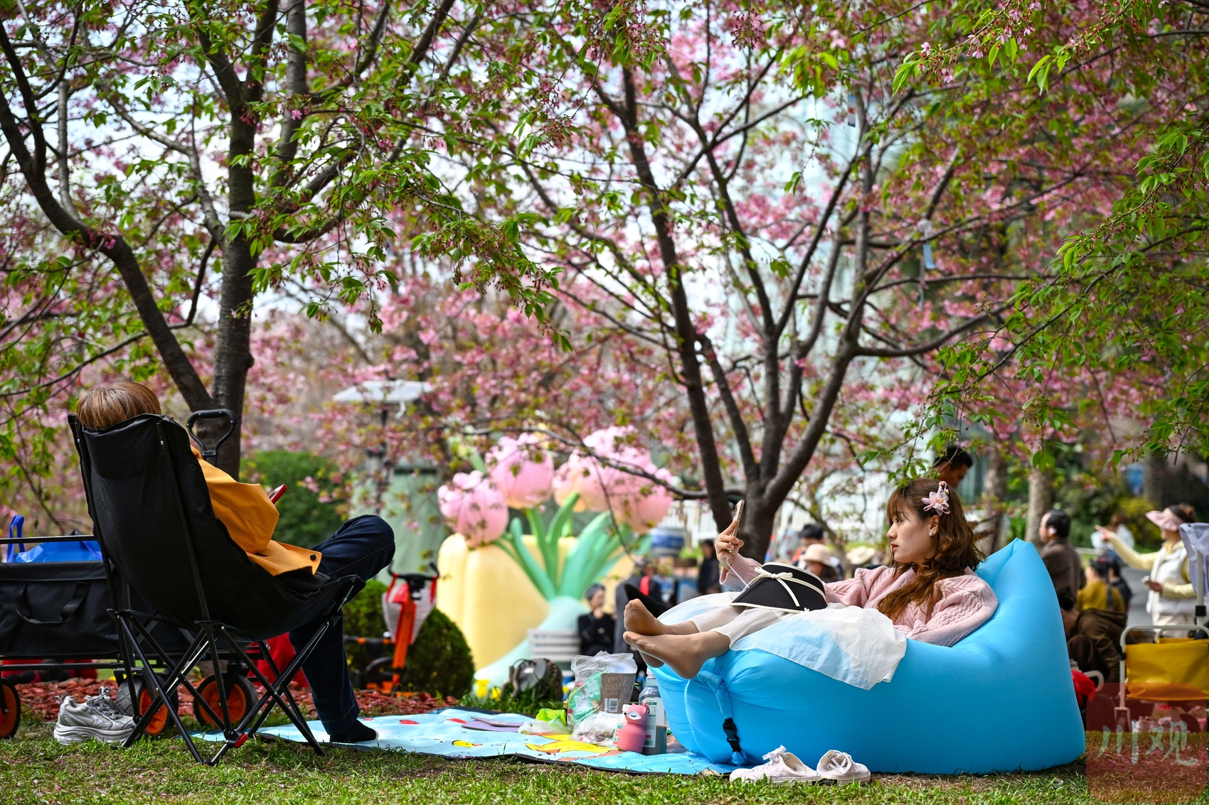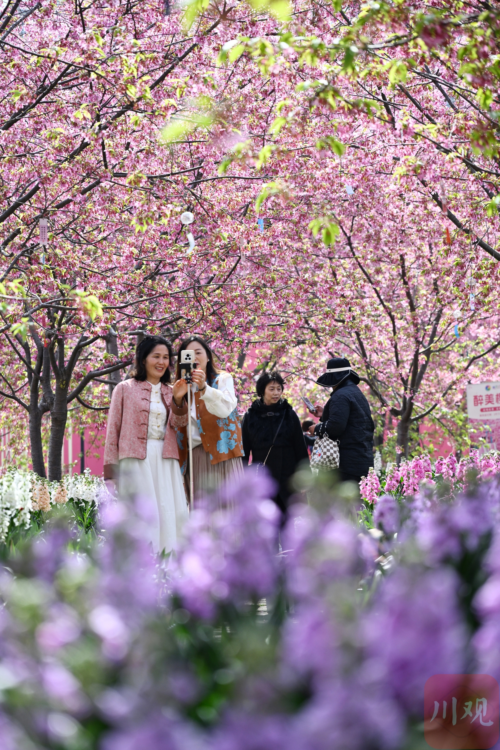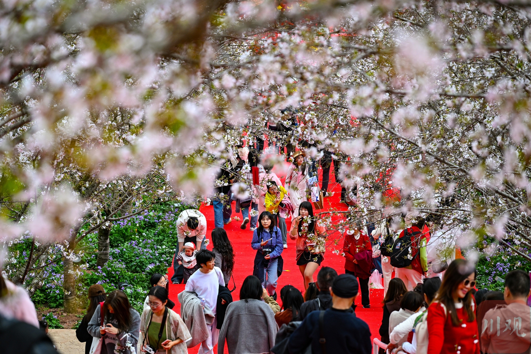 2026年3月4日,成都天气晴好,成都漫花庄园人流如织,成千上万朵樱花缀满枝头,与连片绽放的虞美人、郁金香等花卉相映成趣,织就一幅五彩斑斓的春日画卷,犹如春天里大自然的“调色盘”。
