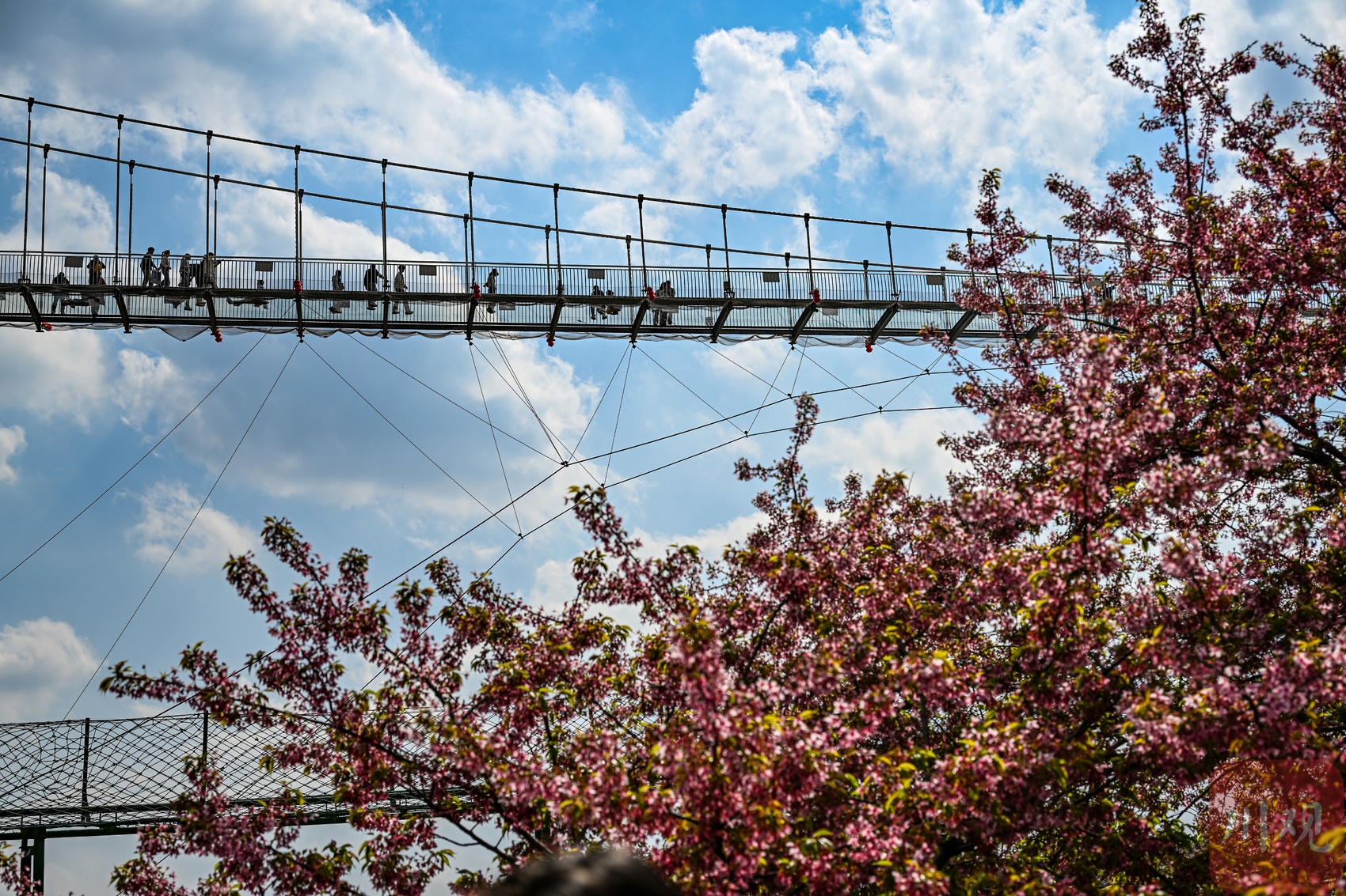 2026年3月4日,游客在四川省成都市新都区漫花庄园里的玻璃栈道上赏花。