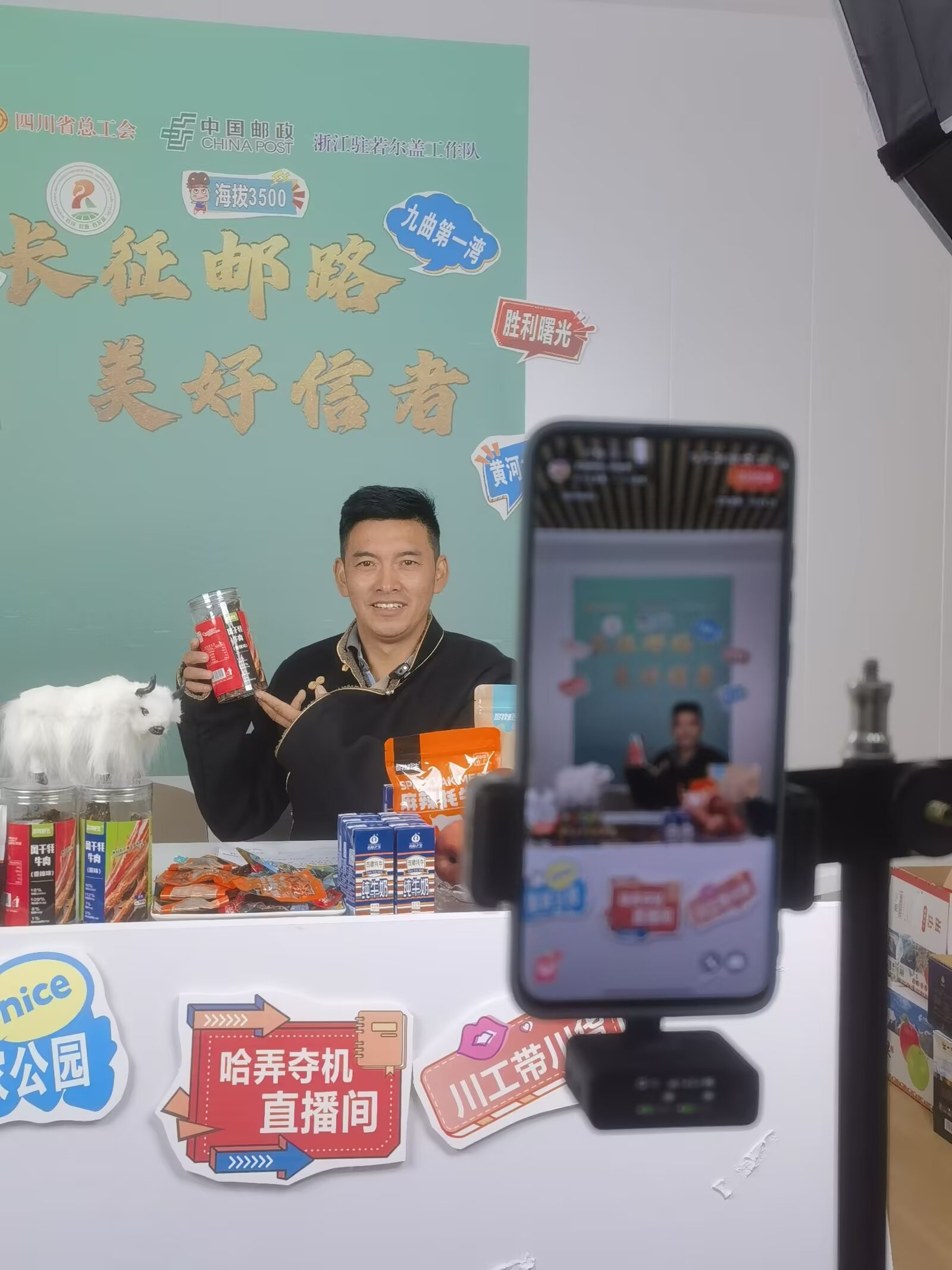 18年来,哈弄夺机从“草原信使”变身为“快递小哥”,为了帮乡亲们增收致富,如今他又跨界成为本地特色农牧产品的“带货主播”,为高原牧民们铺就了一条“暖心”邮路。他积极响应党和国家号召,借助邮政“四流合一”优势,助力乡村全面振兴。2020年“哈弄夺机电商工作室”成立,通过直播带货帮助当地农特产品找到好销路、卖出好价格。2021至2025年,工作室共开展直播带货11次,销售额超400万元,牦牛肉、奶制品、酥油茶等高原特产,在他的推介下走向更大市场、更多家庭。