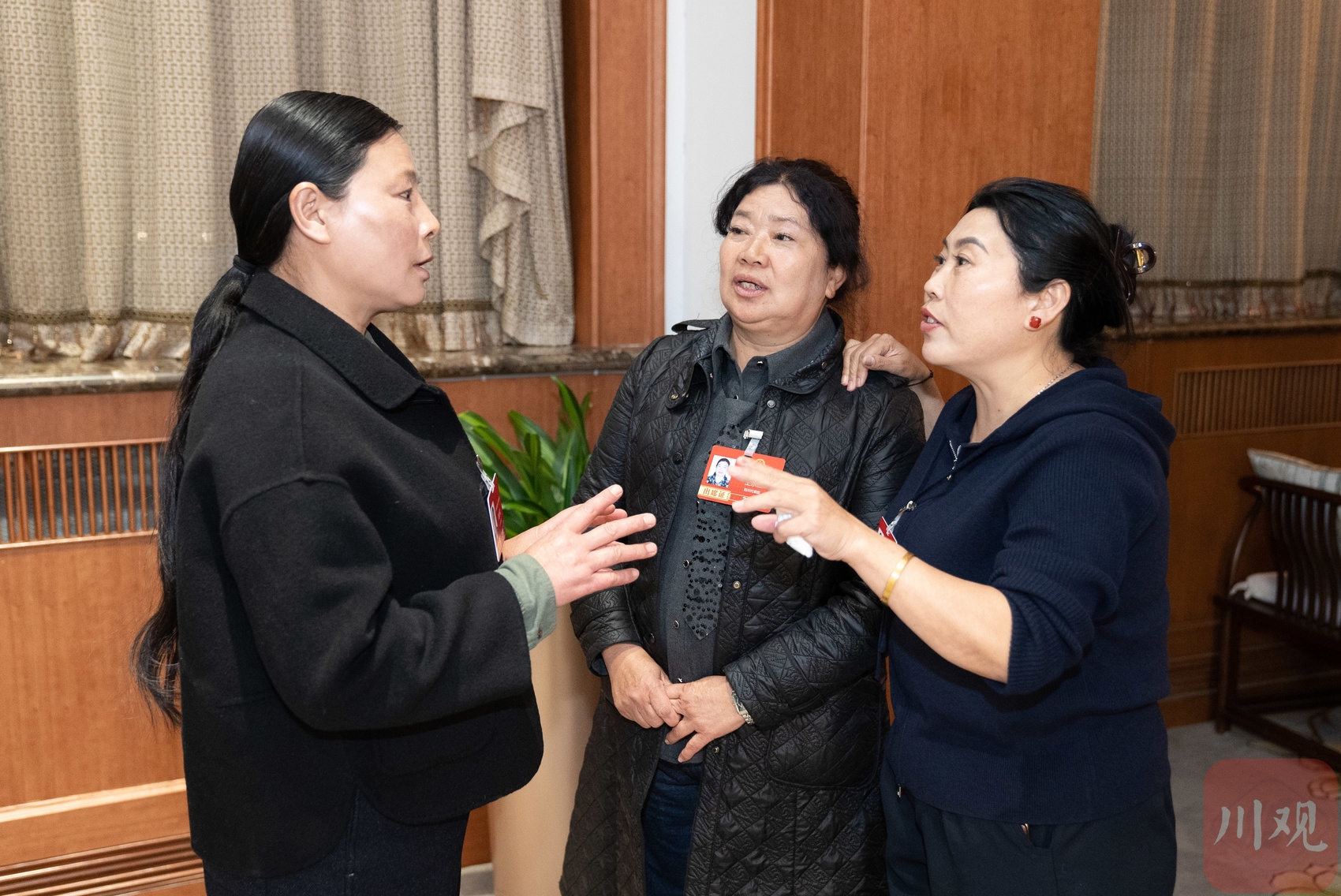 全国人大代表套陶勋花(左)、王永兰(中)和余德春在讨论完善相关建议。