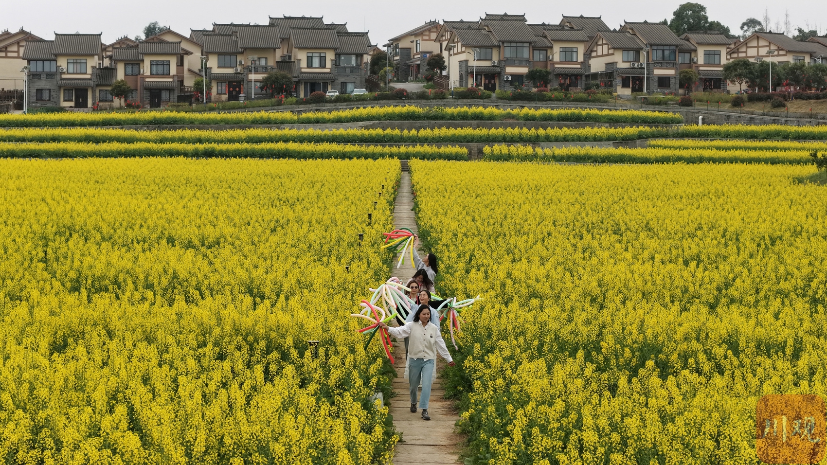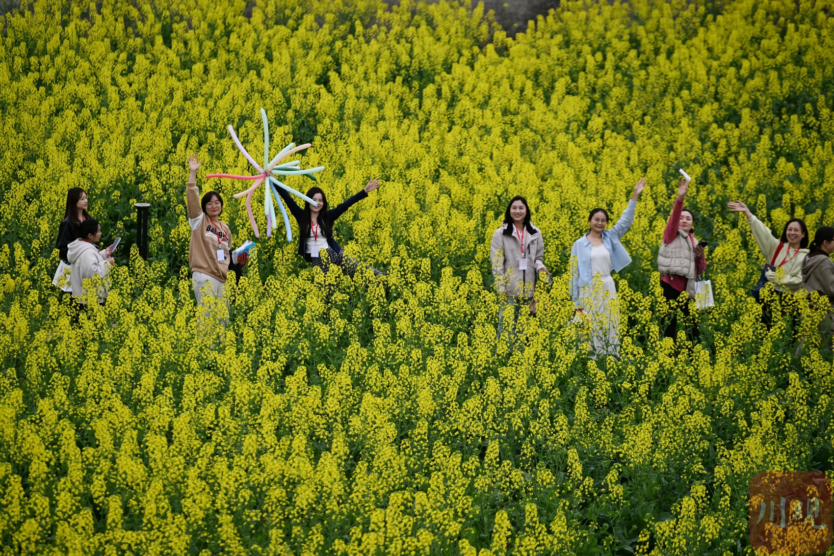2026年3月5日,在四川省成都市双流区永安镇梨园村,女性职工在油菜花田里感受乡村新貌。
