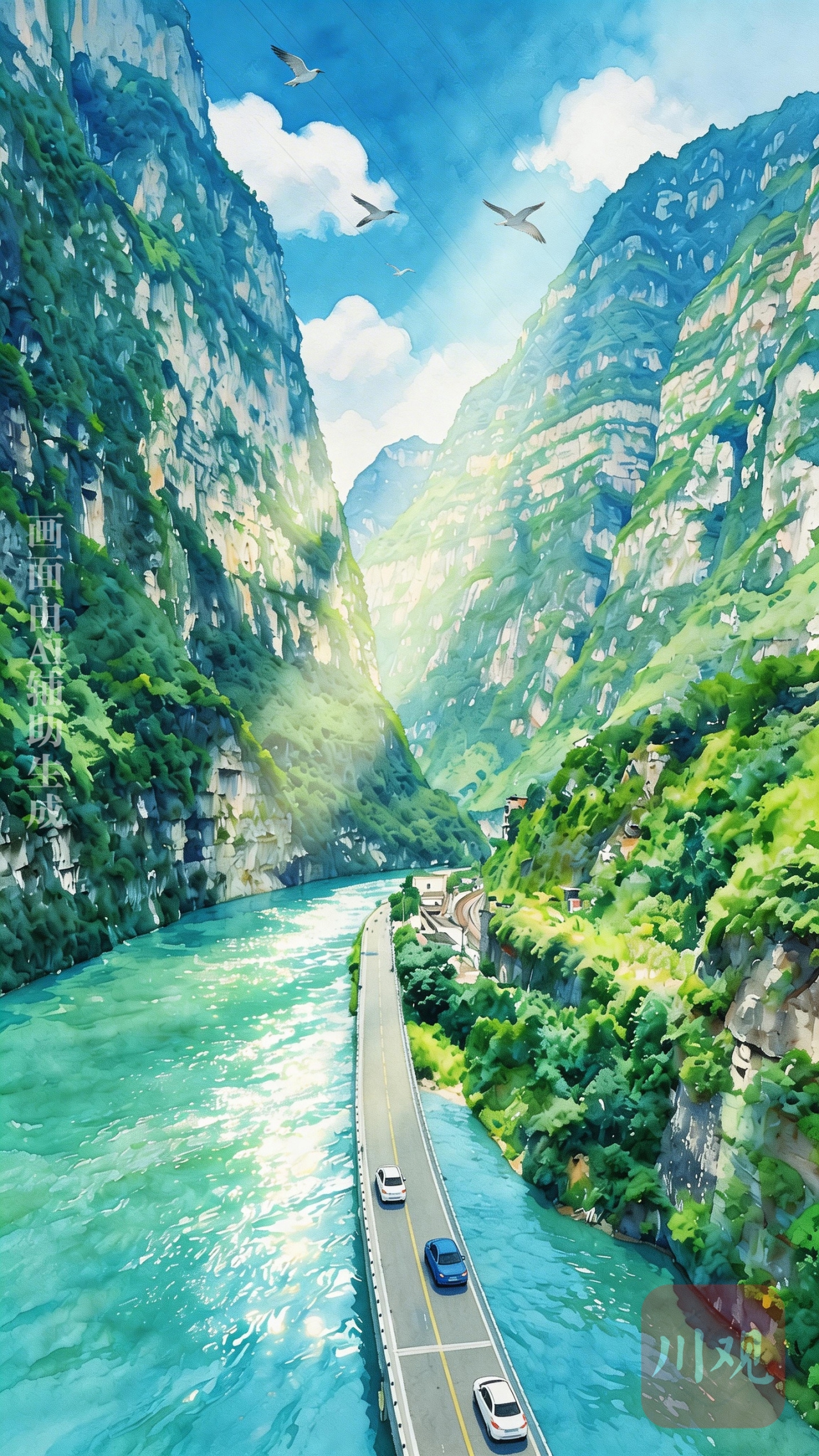 快看哟,忽儿一线天中万道金光辉映着峰峰岭岭若浓若淡、忽近忽远、奇绝妙绝;对面绿树葱葱的高崖上垂下的百丈悬泉似一幅长长的白布帘飞湍奔腾,何其壮观!一忽儿一群白鹭从蓝悠悠的河面上扑楞楞地飞掠而过,奔向白云蓝天;一忽儿见一只苍鹰张开如轮的翅羽在高山之巅左右盘旋,然后俯冲而下钻进蓝蓝的水面,叼住一尾鱼儿又呀呀呀地鸣叫着掠过水面,栖息悬崖峭壁间。