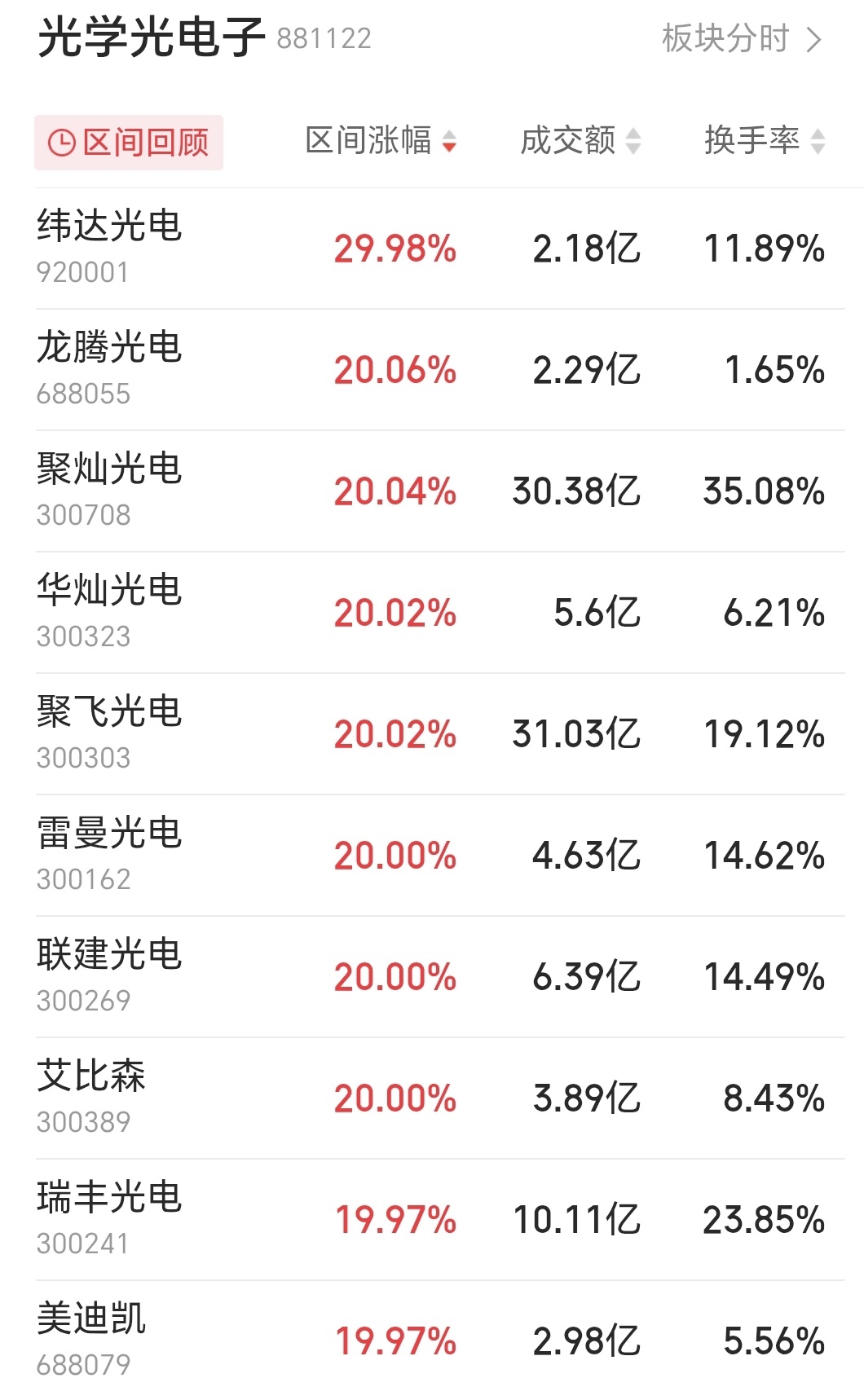 盘面上,芯片板块强势领涨,国芯科技、佰维存储等个股涨幅居前。与此同时,MicroLED概念全线爆发,光学光电子板块超百股上涨,10只个股收获20%涨停。
