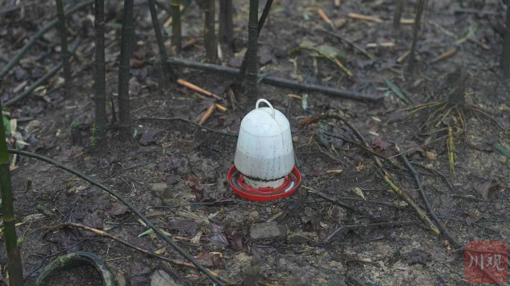 在这600平方米的“大房子”里,很少有人工痕迹。除了一个自动饮水的装置和一个喂食的桶,其他全是野生的模样。“晚上它们就睡树上。”何家发抬头指了指高处的树冠。白天在林下刨食,夜里上树睡觉,这正是四川山鹧鸪的习性,也是训练基地想给它们营造的“准野外”环境。