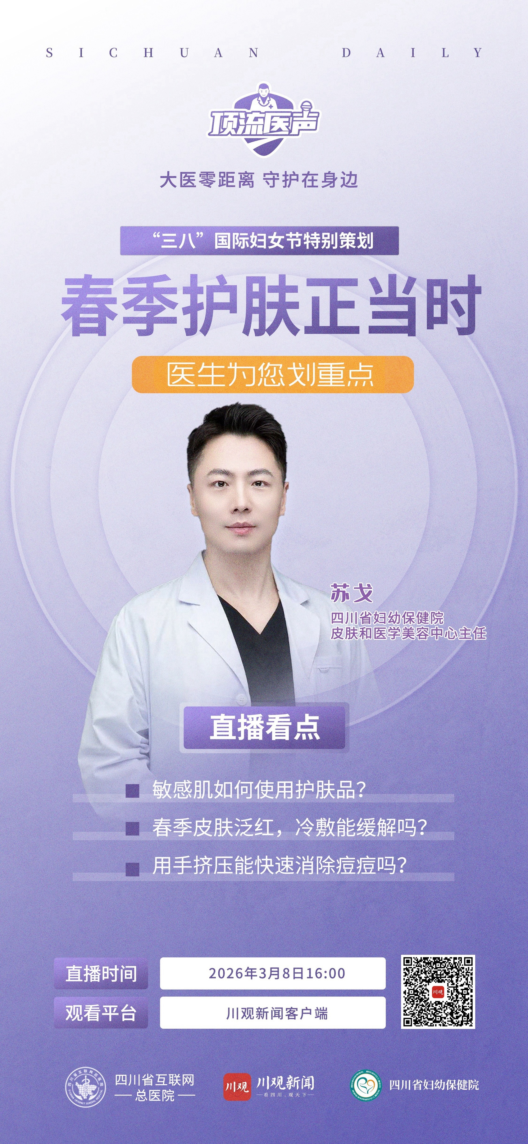 3月8日,川观健康日,川观新闻联合四川省互联网总医院推出“三八”国际妇女节特别策划,送出290个线上免费义诊名额的同时,携手四川省妇幼保健院开展健康主题直播,邀请专家为我们详解春季护肤要点,分享科学护肤、敏肌修护、换季养肤等实用技巧,答疑解惑。