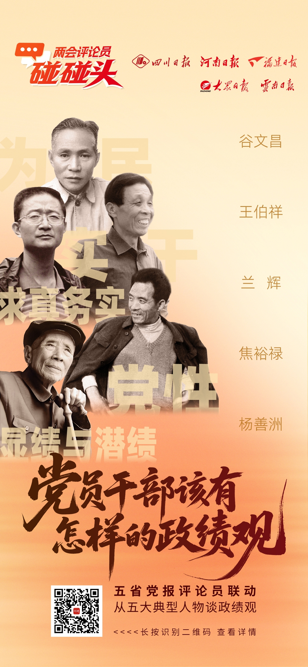 为人民出政绩,要把群众满意作为最高标准。在东山县14年,谷文昌既办“大事”——治风沙、筑海堤、兴盐场、修水利等;也做“小事”——资助贫困学生,为来访群众买车票,为民工买红糖熬姜汤……总之,群众想什么、盼什么,他就干什么。1987年,他魂归东山,当地百姓泣泪相迎。此后经年,群众自发捐资建纪念馆和塑像,自愿为他扫墓。可见,真正的政绩,不是上级“评”出来、报表“算”出来的,而是群众“感”出来的。面对新形势、新任务,党员干部不妨多问问自己,手上的工作,能否让人民得实惠、生活得改善、权益得保障?