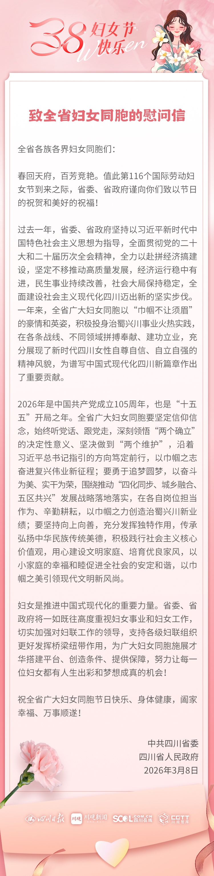 春回天府,百芳竞艳。值此第116个国际劳动妇女节到来之际,省委、省政府谨向你们致以节日的祝贺和美好的祝福!