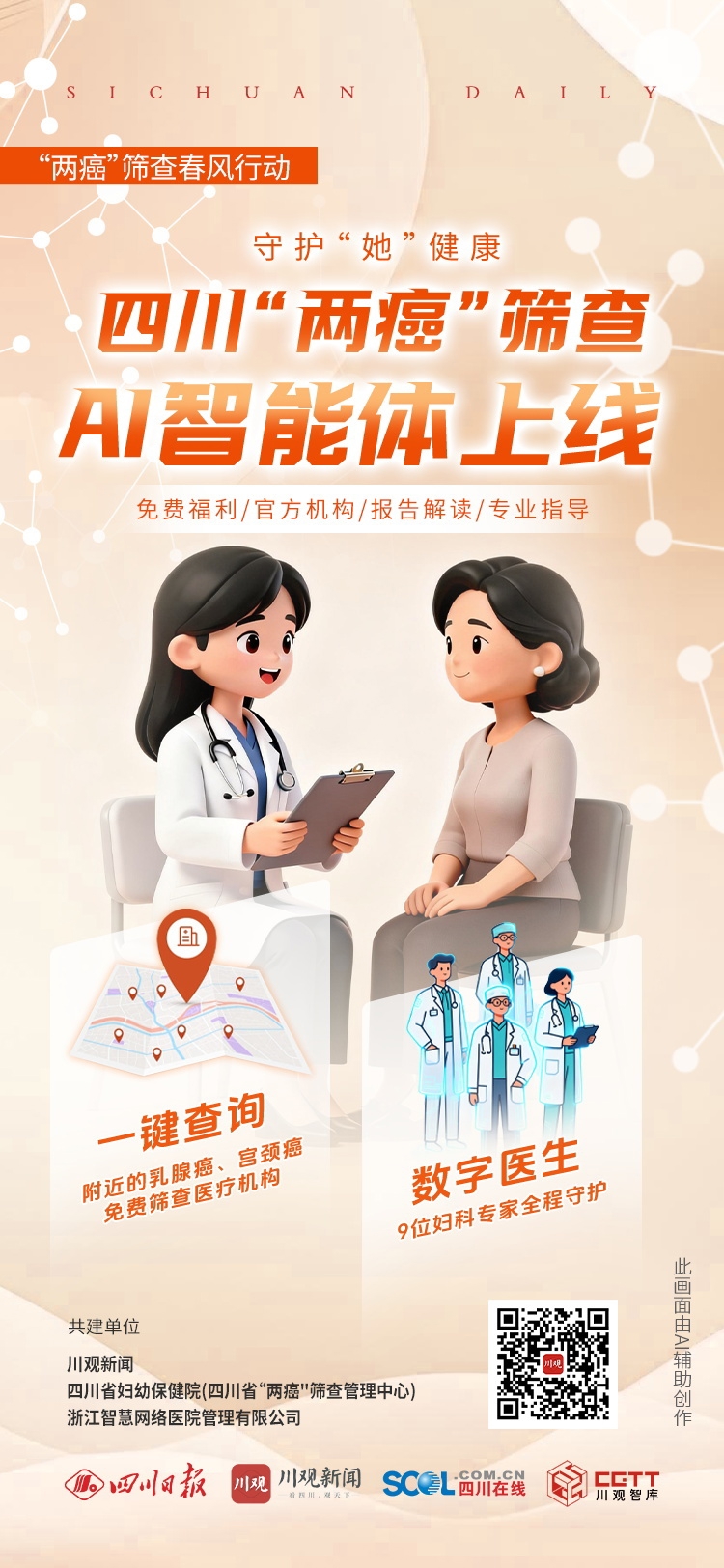3月8日,在第116个“三八”国际妇女节来临之际,川观新闻联合四川省妇幼保健院(四川省“两癌”筛查管理中心)、浙江智慧网络医院管理有限公司开展“两癌筛查”春风行动,在原有的四川“两癌”筛查小程序基础上,升级推出四川“两癌”筛查AI智能体。用户通过川观新闻客户端登录AI智能体,不仅能快速查询身边最近的“两癌”免费筛查医疗机构,还有9位妇科领域数字医生提供24小时问诊服务,一站式解决免费筛查、专家问诊需求。