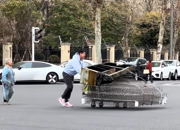 视频显示,当时唐创推着一板车货物正在过一个需要上坡的十字路口,板车上货物的体积和重量都不小,一位身着围裙的白发奶奶则跟在他身后,期间唐创还转过头问老人“要推到哪里?”老人给他指了方向。