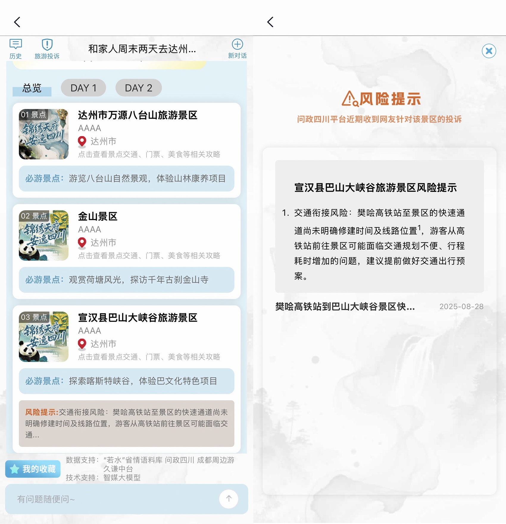 当你在熊猫路书查询旅游攻略时,若所查景区有风险提示,只需轻轻一点对应提示点,就能直观查看网友近期针对该景区的相关投诉原帖,提前摸清出行注意事项,避开所有出行隐患。