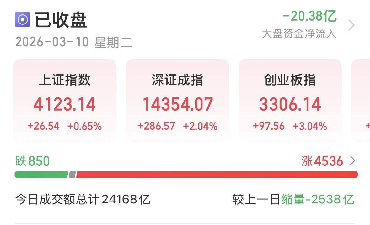 3月10日,A股三大指数集体收涨,沪指涨0.65%,收报4123.14点;深证成指涨2.04%,收报14354.07点;创业板指涨3.04%,收报3306.14点。全市场成交额24168亿元,较昨日缩量2538亿元。