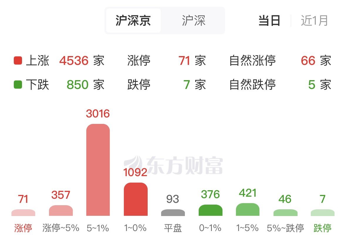 个股层面,市场情绪高涨。全市场超4500只个股实现上涨,其中涨幅在1%—5%的个股达3016只,涨停个股71只;与之相对,仅有850只个股下跌,赚钱效应显著。