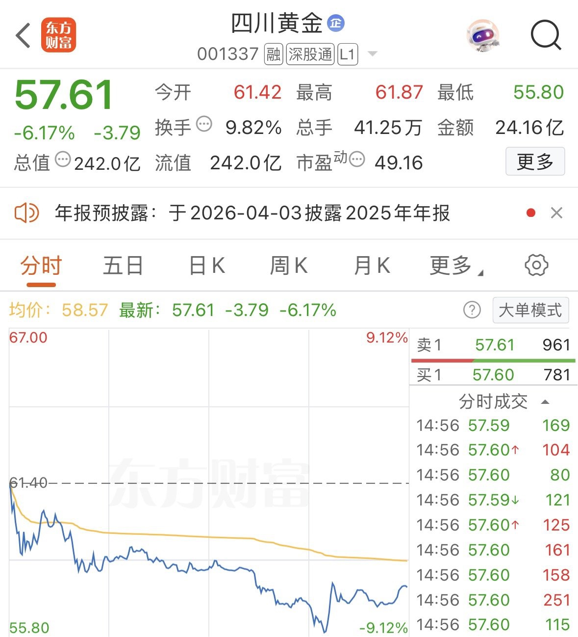 四川板块方面,四川黄金低开低走,盘中一度跌超9%,截至收盘下跌6.17%,位居川股跌幅榜首,收报57.61元/股,总市值242亿元。