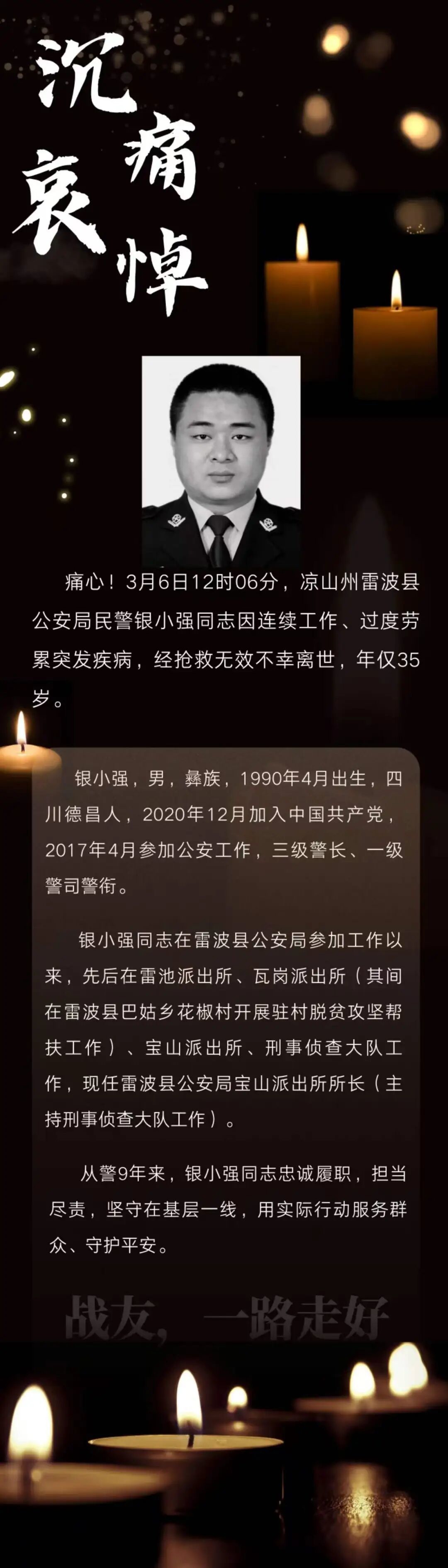 痛心!3月6日12时06分,凉山州雷波县公安局民警银小强同志因连续工作、过度劳累突发疾病,经抢救无效不幸离世,年仅35岁。这是四川在线记者3月10日从省公安厅获悉的信息。