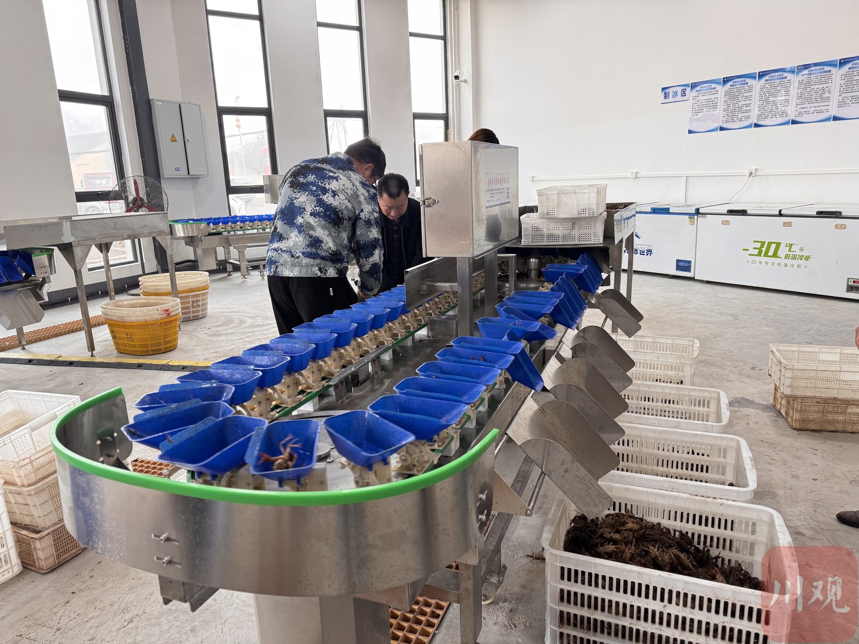 数据在显示屏上实时跳动,小龙虾也根据重量被分拨到大、中、小三个不同规格的筐中,全程无需人工干预。一旁的打包区,工作人员正熟练地将分拣好的小龙虾装入泡沫箱,注入干冰、封箱、贴单。门外,又一辆满载小龙虾的三轮车从太伏镇赶来,在一旁等待分拣。