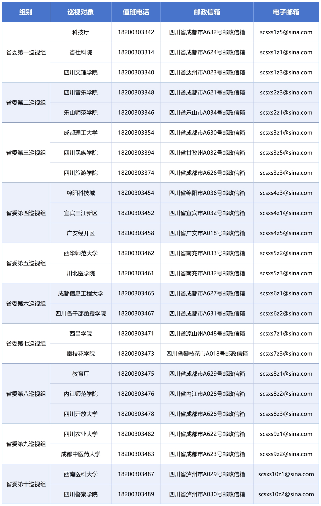 巡视期间,各省委巡视组设置了值班电话、邮政信箱、电子邮箱和“四川码上巡”二维码。巡视组主要受理反映被巡视党组织领导班子及其成员和下一级党组织领导班子主要负责人,以及重点岗位人员问题的来信、来电、来访,重点是关于违反政治纪律、组织纪律、廉洁纪律、群众纪律、工作纪律和生活纪律以及巡视整改等方面的问题反映。对其他不属于巡视受理范围的信访问题,将按规定由被巡视单位和有关部门认真处理。