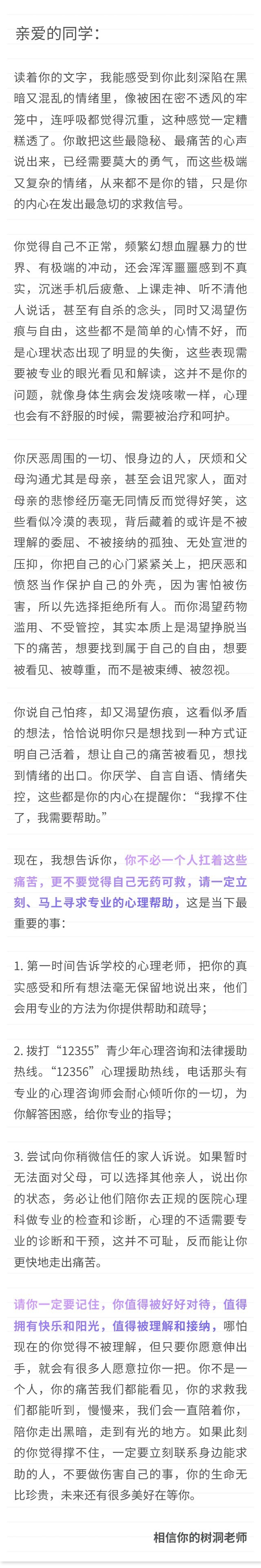 一位初中生:我觉得我自己不正常,我频繁地幻想血腥和暴力的世界,喜欢把感情寄托于不存在的人身上。我有时会浑浑噩噩感到不真实,沉迷于手机后又会无来由的疲惫。身边的人都不理解我,我认为他们很让人讨厌。我厌学了,有时恍惚会自言自语,他人跟我说话时,我也会听不见或者是听不清,上课时我总是走神。我想知道这是什么病状,是否是心理疾病的其中一种?