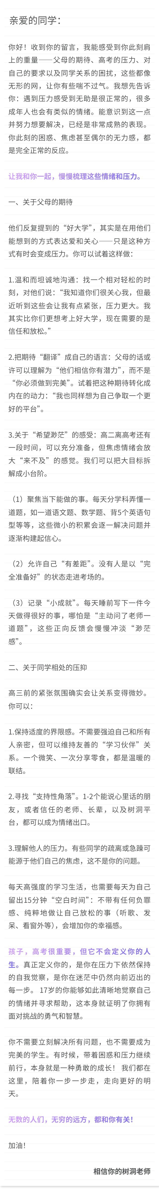 一位高三学生:快要高考了,父母经常有意无意提到考好大学,感到很窒息,我也想要考好一点的大学,但感觉到希望渺茫,跟同学相处也很压抑,想请老师帮忙,我要怎么做?