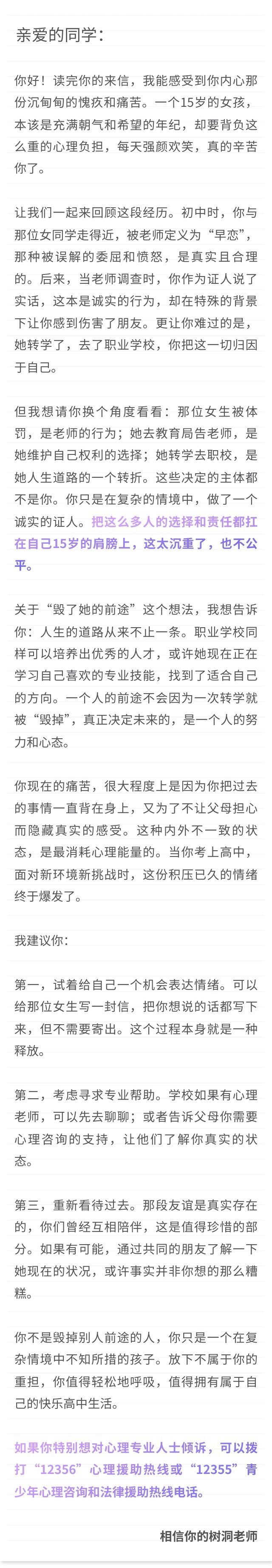 一位15岁高中生:我初中时跟一个女同学走得很近,但是被老师发现后直接定义是“早恋”,我内心感到委屈和愤怒,后来,该女生因其他原因被老师体罚了,女生将老师告到教育局,老师在接受调查询问时又找到了我,我做了证人,感觉又伤害了那位女生。后来女生转学,我心里一直愧疚至今,感觉自己毁了她的前途,为了父母不担心,我每天强颜欢笑,直至现在考上高中。我再也坚持不了了,不愿意上学。