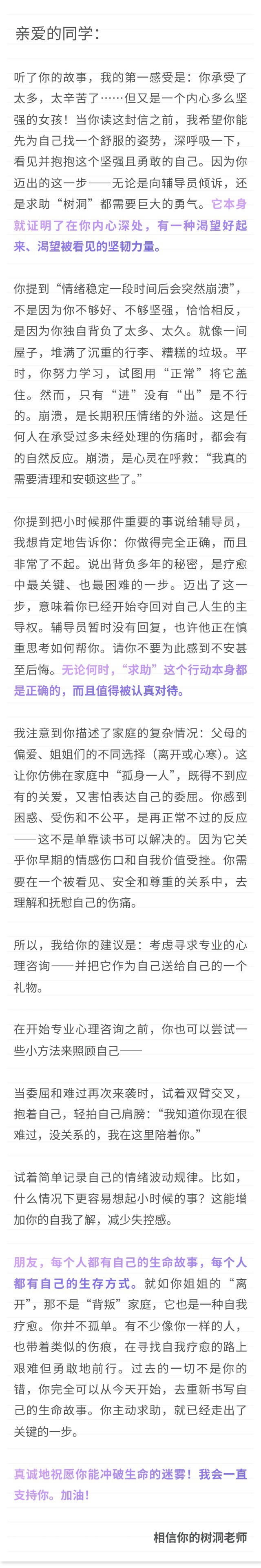 一位18岁女大学生:我小时候的一些不好经历,经常影响我的情绪。我情绪稳定一段时间过后,就会崩溃。我上周第一次把小时候那件事给辅导员说,但是他现在都没有回我。我是不是,不该说。我家庭情况挺复杂的,父母都偏爱弟弟。我有两个姐姐,一个和家里闹掰了基本上没有联系,另外一个大三,也是对父母失望寒心。