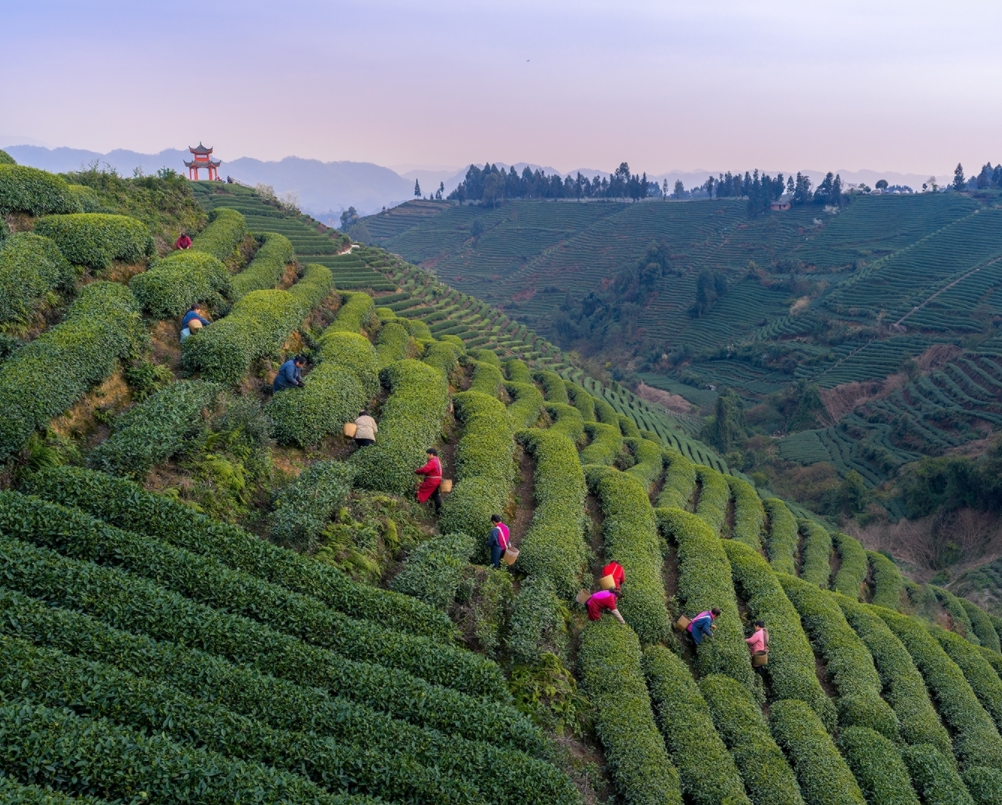 作品介绍:在雅安名山牛碾坪生态茶园,一群茶农正在梯田茶园采茶。