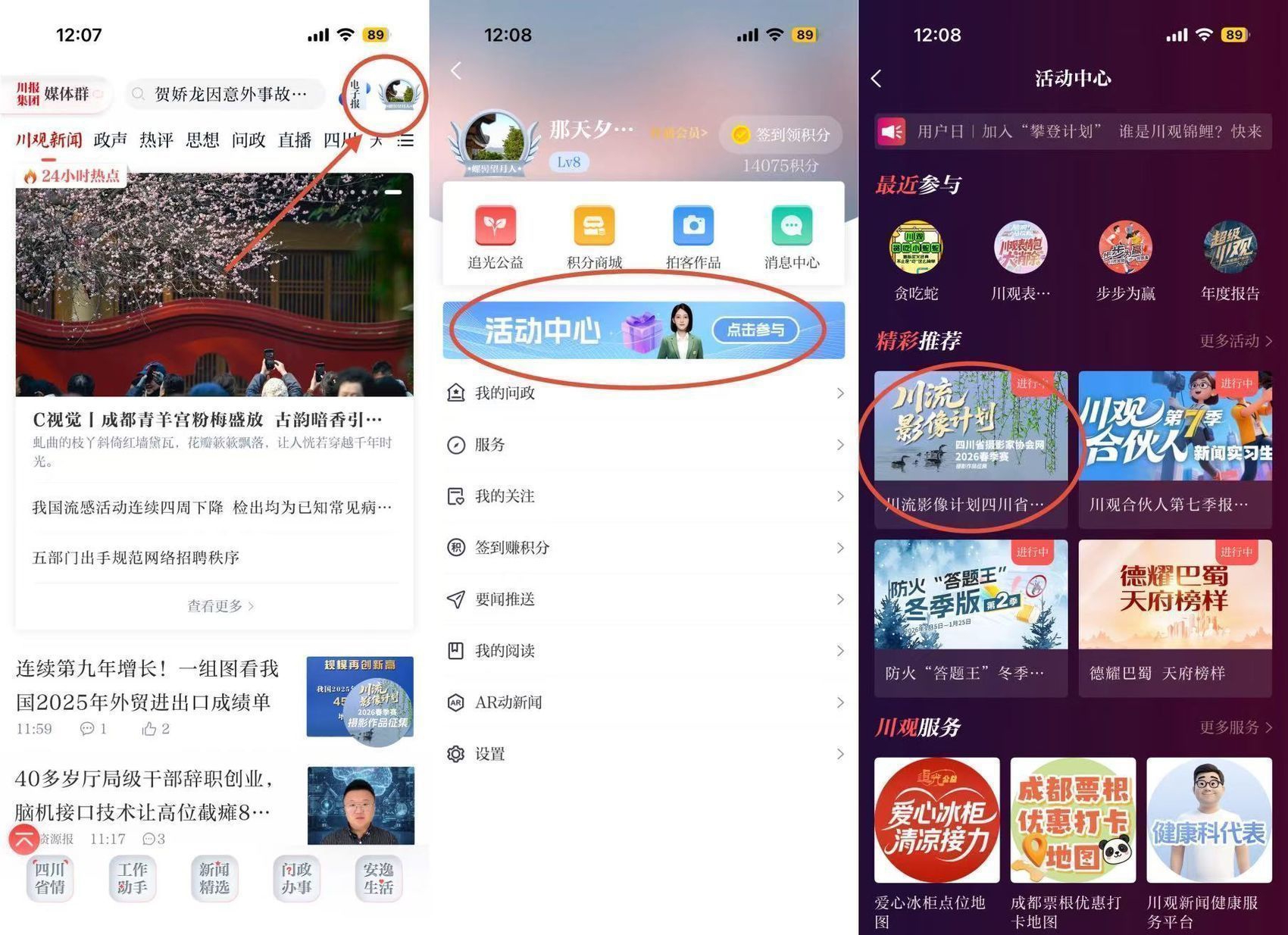 方式二:在川观新闻首页,点击右上角“我的”,再点击“活动中心”,找到“川流影像”投稿通道图片,点击即可参与投稿;