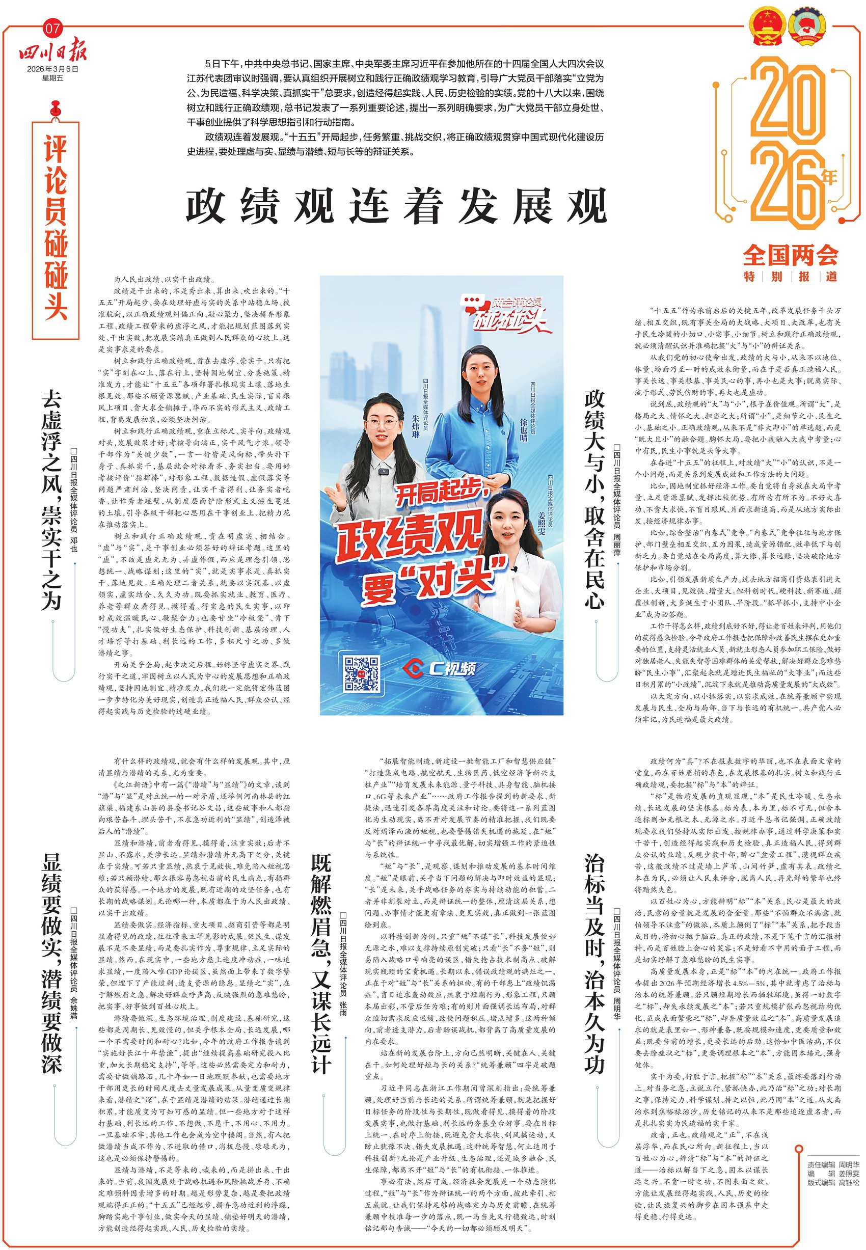 会前,团队深入研读近期习近平总书记重要讲话精神,中央精神、经济形势与政策脉络,分析可能的热点与方向。这并非为了“押题”,而是绘制一幅精细的“议程可能性地图”。如在总书记下团组等关键议程前,记者团队已系统梳理近年来相关讲话脉络,当3月5日总书记在江苏团强调“树立和践行正确政绩观”后,四川日报当日立即推出评论《开局起步,政绩观要“对头”丨两会评论员碰碰头》,正是“预研+速响”能力的体现。同样,在政府工作报告发布后,迅速推出的连版特别报道,以可视化方式清晰呈现报告骨架与精髓,将国家大战略转化为可感可知的新闻议题。《两会好声音》,不是简单摘抄代表委员会场发言,而是围绕大局大势,筛选代表委员相关观点,快采快拍快剪,短小精悍、入耳入心,两会好声音一键直达。